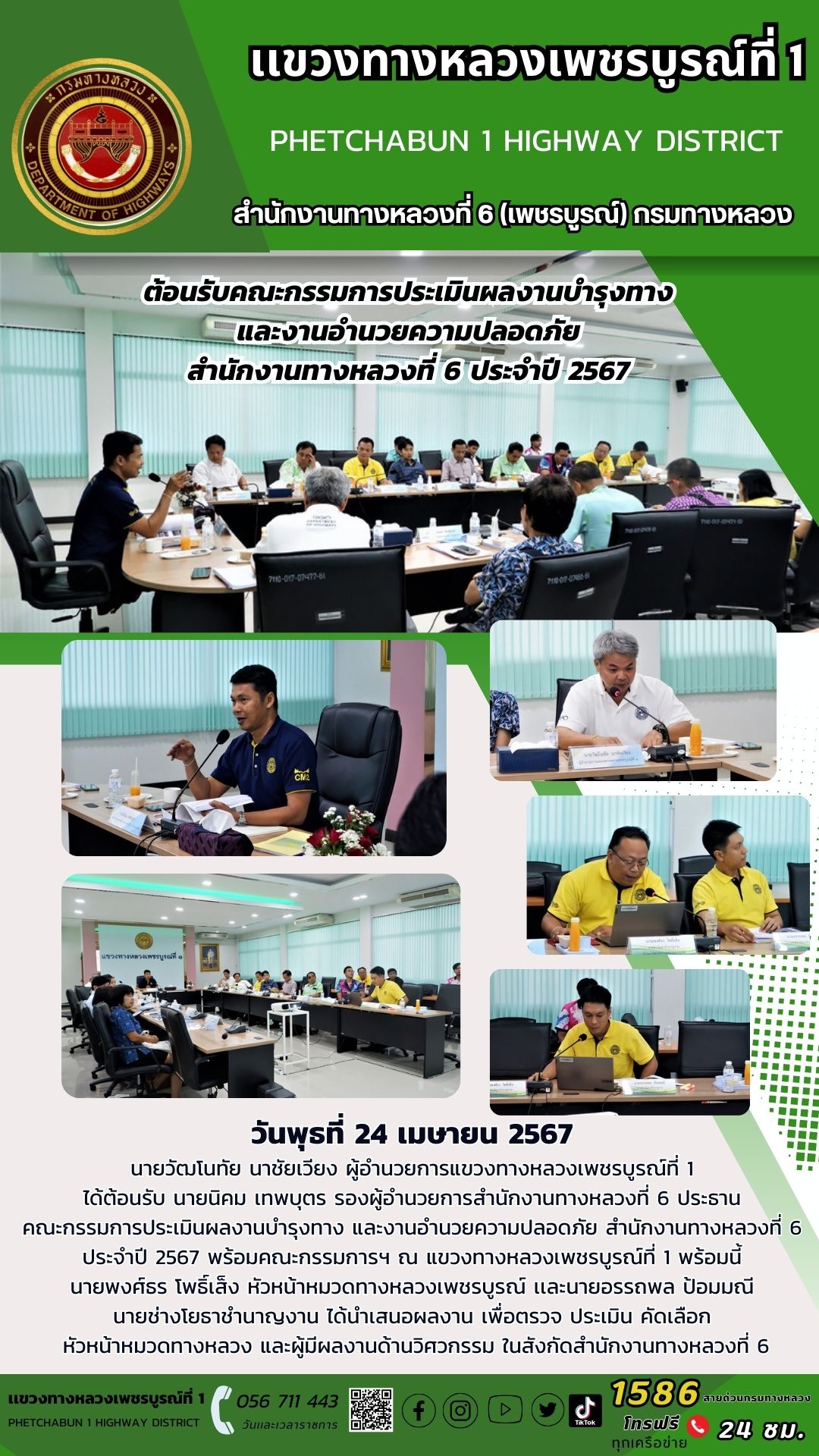 วันพุธที่ 24 เมษายน 2567 นายวัฒโนทัย นาชัยเวียง ผู้อำนวยการแขวงทางหลวงเพชรบูรณ์ที่ 1 ได้ต้อนรับ นายนิคม เทพบุตร รองผู้อำนวยการสำนักงานทางหลวงที่ 6 ประธาน คณะกรรมการประเมินผลงานบำรุงทาง และงานอำนวยความปลอดภัย สำนักงานทางหลวงที่ 6 ประจำปี 2567 พร้อมคณะกรรมการฯ ณ แขวงทางหลวงเพชรบูรณ์ที่ 1 พร้อมนี้ นายพงศ์ธร โพธิ์เส็ง หัวหน้าหมวดทางหลวงเพชรบูรณ์ เเละนายอรรถพล ป้อมมณี นายช่างโยธาชำนาญงาน ได้นำเสนอผลงาน เพื่อตรวจ ประเมิน คัดเลือก หัวหน้าหมวดทางหลวง และผู้มีผลงานด้านวิศวกรรม ในสังกัดสำนักงานทางหลวงที่ 6