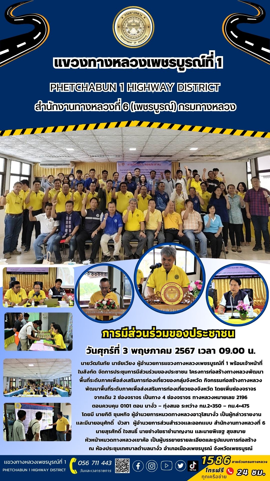 นายวัฒโนทัย นาชัยเวียง ผู้อำนวยการแขวงทางหลวงเพชรบูรณ์ที่ 1 พร้อมเจ้าหน้าที่ในสังกัด จัดการประชุมการมีส่วนร่วมของประชาชน โครงการก่อสร้างทางหลวงพัฒนาพื้นที่ระดับภาคเพื่อส่งเสริมการท่องเที่ยวของกลุ่มจังหวัด กิจกรรมก่อสร้างทางหลวงพัฒนาพื้นที่ระดับภาคเพื่อส่งเสริมการท่องเที่ยวของจังหวัด โดยเพิ่มช่องจราจร จากเดิม 2 ช่องจราจร เป็นทาง 4 ช่องจราจร ทางหลวงหมายเลข 2196 ตอนควบคุม 0101 ตอน นางั่ว – ทุ่งสมอ ระหว่าง กม.2+350 – กม.4+475 โดยมี นายกิติ ชุนหกิจ ผู้อำนวยการหมวดทางหลวงอาวุโสนางั่ว เป็นผู้กล่าวรายงาน เเละมีนายอนุศักดิ์ บัวสา ผู้อำนวยการส่วนสำรวจเเละออกเเบบ สำนักงานทางหลวงที่ 6 นายสุรศักดิ์ ใจสนธิ์ นายช่างโยธาชำนาญงาน เเละนายพิเชฐ สุขสบาย หัวหน้าหมวดทางหลวงเขาค้อ เป็นผู้บรรยายรายละเอียดและรูปแบบการก่อสร้าง ณ ห้องประชุมเทศบาลตำบลนางั่ว อำเภอเมืองเพชรบูรณ์ จังหวัดเพชรบูรณ์