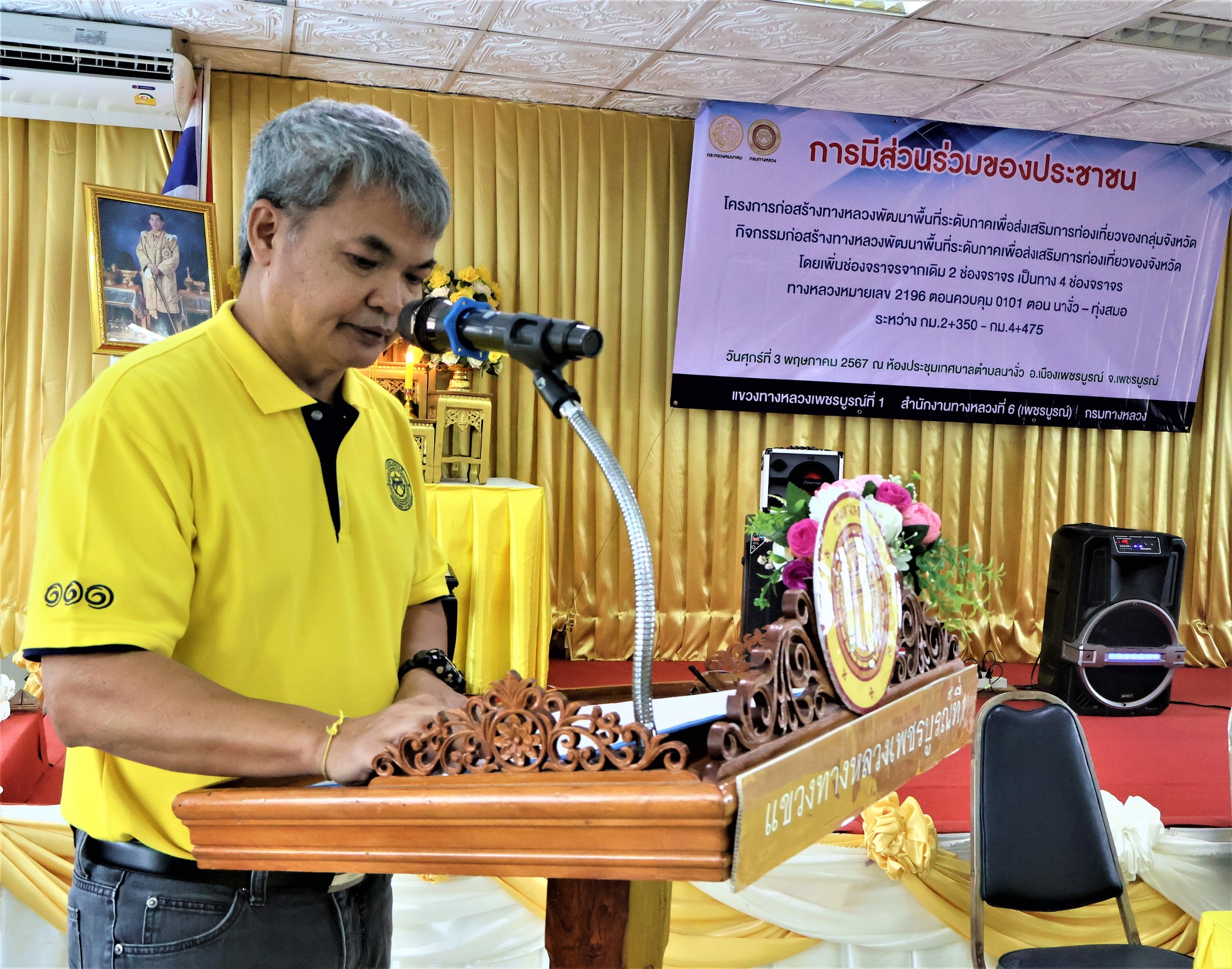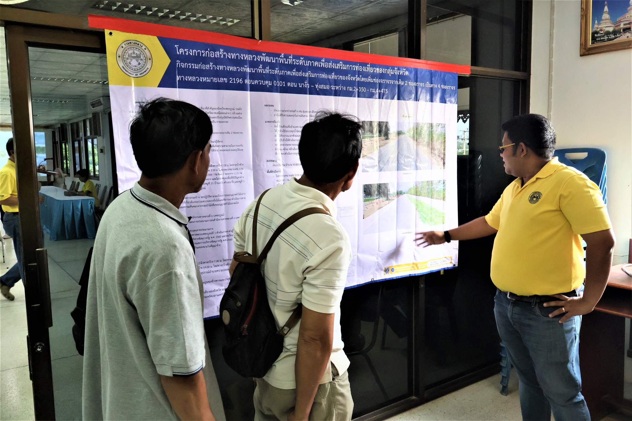 จัดการประชุมการมีส่วนร่วมของประชาชน โครงการก่อสร้างทางหลวงพัฒนาพื้นที่ระดับภาคเพื่อส่งเสริมการท่องเที่ยวของกลุ่มจังหวัด กิจกรรมก่อสร้างทางหลวงพัฒนาพื้นที่ระดับภาคเพื่อส่งเสริมการท่องเที่ยวของจังหวัด โดยเพิ่มช่องจราจร จากเดิม 2 ช่องจราจร เป็นทาง 4 ช่องจราจร ทางหลวงหมายเลข 2196 ตอนควบคุม 0101 ตอน นางั่ว – ทุ่งสมอ ระหว่าง กม.2+350 – กม.4+475