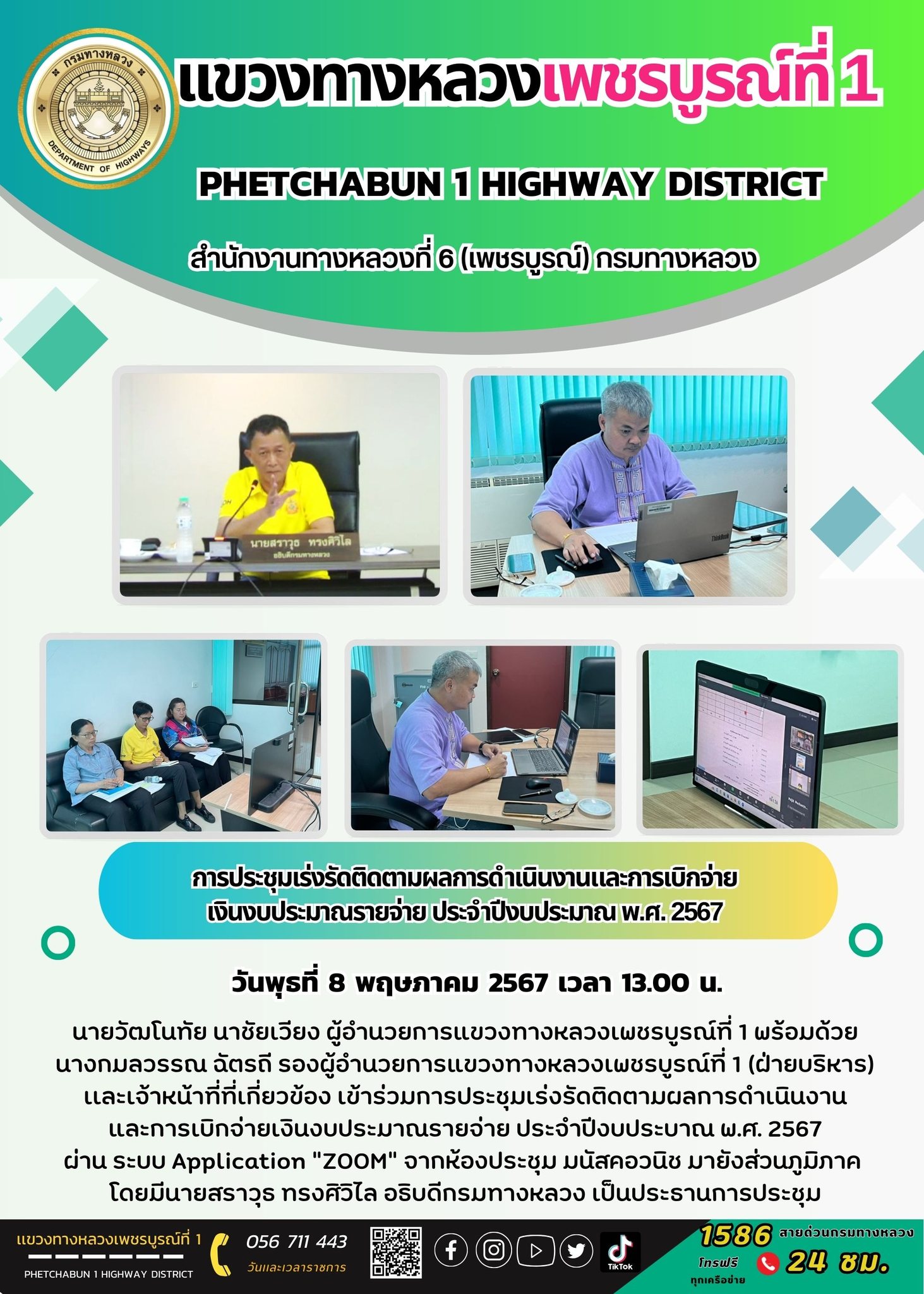 วันพุธที่ 8 พฤษภาคม 2567 เวลา 13.00 น. นายวัฒโนทัย นาชัยเวียง ผู้อำนวยการแขวงทางหลวงเพชรบูรณ์ที่ 1 พร้อมด้วย นางกมลวรรณ ฉัตรถี รองผู้อำนวยการแขวงทางหลวงเพชรบูรณ์ที่ 1 (ฝ่ายบริหาร) เเละเจ้าหน้าที่ที่เกี่ยวข้อง เข้าร่วมการประชุมเร่งรัดติดตามผลการดำเนินงานและการเบิกจ่ายเงินงบประมาณรายจ่าย ประจำปีงบประมาณ พ.ศ. 2567ผ่าน ระบบ Application "ZOOM” จากห้องประชุม มนัสคอวนิช มายังส่วนภูมิภาค โดยมีนายสราวุธ ทรงศิวิไล อธิบดีกรมทางหลวง เป็นประธานการประชุม