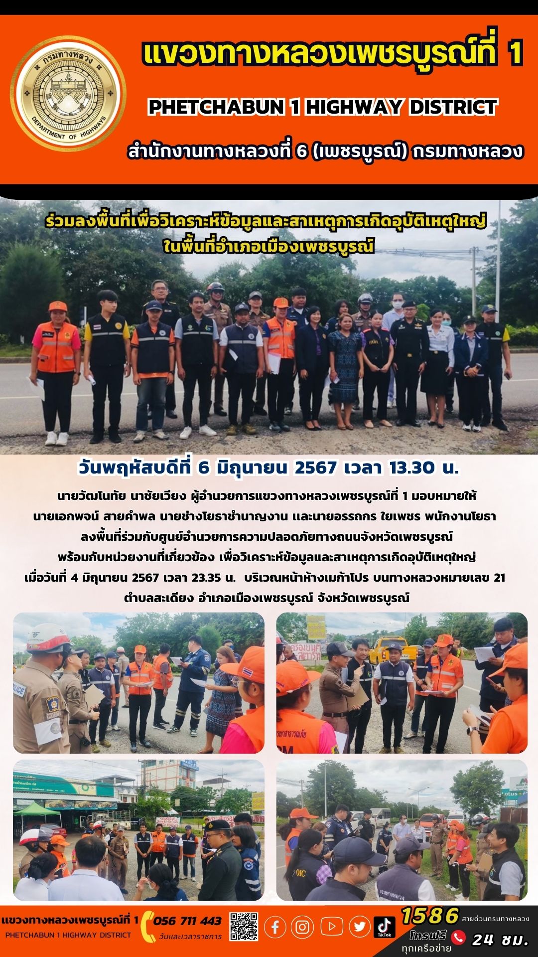นายวัฒโนทัย นาชัยเวียง ผู้อำนวยการแขวงทางหลวงเพชรบูรณ์ที่ 1 มอบหมายให้นายเอกพจน์ สายคำพล นายช่างโยธาชำนาญงาน เเละนายอรรถกร ใยเพชร พนักงานโยธา ลงพื้นที่ร่วมกับศูนย์อำนวยการความปลอดภัยทางถนนจังหวัดเพชรบูรณ์ พร้อมกับหน่วยงานที่เกี่ยวข้อง เพื่อวิเคราะห์ข้อมูลและสาเหตุการเกิดอุบัติเหตุใหญ่ เมื่อวันที่ 4 มิถุนายน 2567 เวลา 23.35 น. บริเวณหน้าห้างเมก้าโปร บนทางหลวงหมายเลข 21 ตำบลสะเดียง อำเภอเมืองเพชรบูรณ์ จังหวัดเพชรบูรณ์