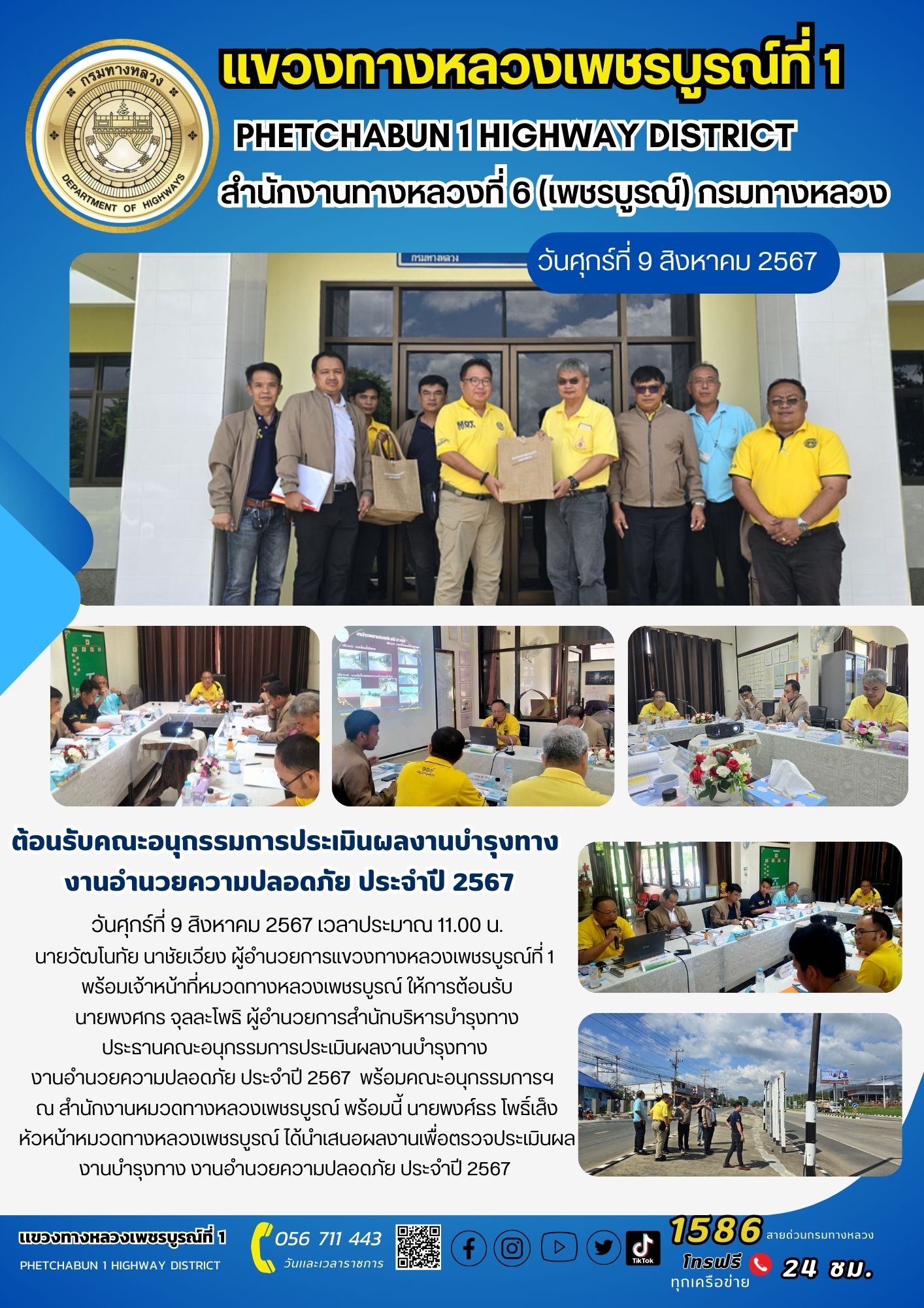 วันศุกร์ที่ 9 สิงหาคม 2567 เวลาประมาณ 11.00 น. นายวัฒโนทัย นาชัยเวียง ผู้อำนวยการแขวงทางหลวงเพชรบูรณ์ที่ 1 พร้อมเจ้าหน้าที่หมวดทางหลวงเพชรบูรณ์ ให้การต้อนรับ นายพงศกร จุลละโพธิ ผู้อำนวยการสำนักบริหารบำรุงทาง ประธานคณะอนุกรรมการประเมินผลงานบำรุงทาง งานอำนวยความปลอดภัย ประจำปี 2567 พร้อมคณะอนุกรรมการฯ ณ สำนักงานหมวดทางหลวงเพชรบูรณ์ พร้อมนี้ นายพงศ์ธร โพธิ์เส็ง หัวหน้าหมวดทางหลวงเพชรบูรณ์ ได้นำเสนอผลงานเพื่อตรวจประเมินผลงานบำรุงทาง งานอำนวยความปลอดภัย ประจำปี 2567