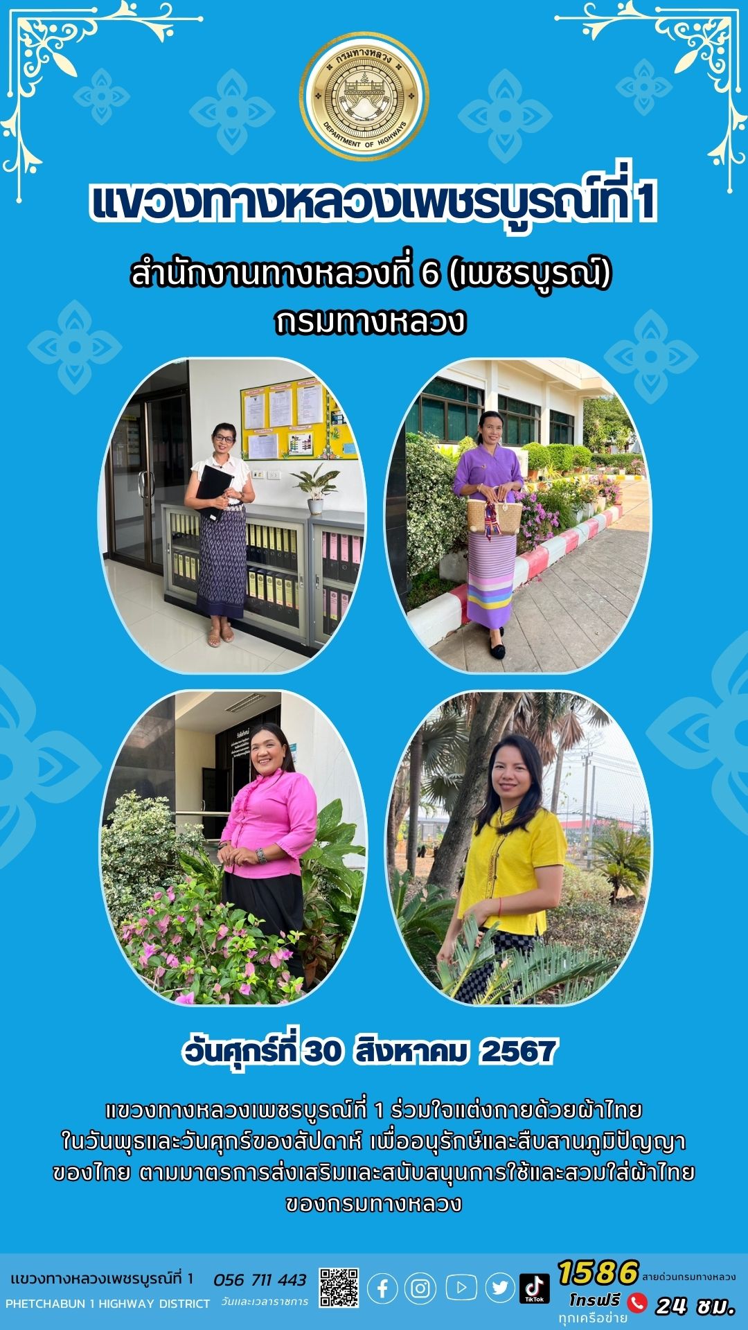 วันศุกร์ที่ 30 สิงหาคม 2567 แขวงทางหลวงเพชรบูรณ์ที่ 1 ร่วมใจแต่งกายด้วยผ้าไทยในวันพุธและวันศุกร์ของสัปดาห์ เพื่ออนุรักษ์และสืบสานภูมิปัญญาของไทย ตามมาตรการส่งเสริมและสนับสนุนการใช้และสวมใส่ผ้าไทยของกรมทางหลวง