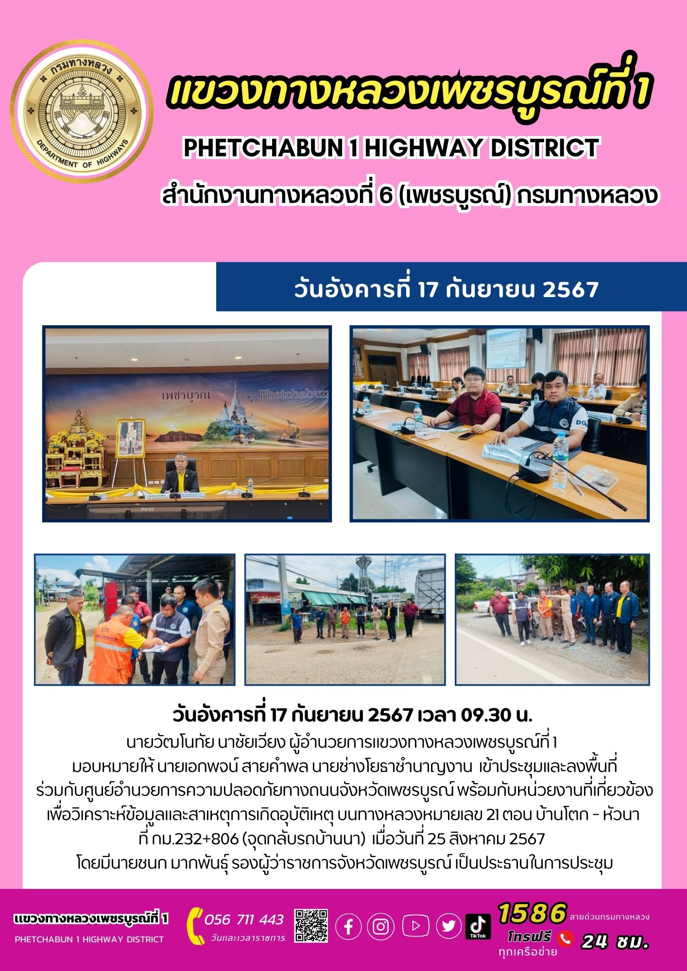วันอังคารที่ 17 กันยายน 2567 เวลา 09.30 น. นายวัฒโนทัย นาชัยเวียง ผู้อำนวยการแขวงทางหลวงเพชรบูรณ์ที่ 1 มอบหมายให้ นายเอกพจน์ สายคำพล นายช่างโยธาชำนาญงาน เข้าประชุมเเละลงพื้นที่ร่วมกับศูนย์อำนวยการความปลอดภัยทางถนนจังหวัดเพชรบูรณ์ พร้อมกับหน่วยงานที่เกี่ยวข้องเพื่อวิเคราะห์ข้อมูลและสาเหตุการเกิดอุบัติเหตุ บนทางหลวงหมายเลข 21 ตอน บ้านโตก - หัวนา ที่ กม.232+806 (จุดกลับรถบ้านนา) เมื่อวันที่ 25 สิงหาคม 2567 โดยมีนายชนก มากพันธุ์ รองผู้ว่าราชการจังหวัดเพชรบูรณ์ เป็นประธานในการประชุม