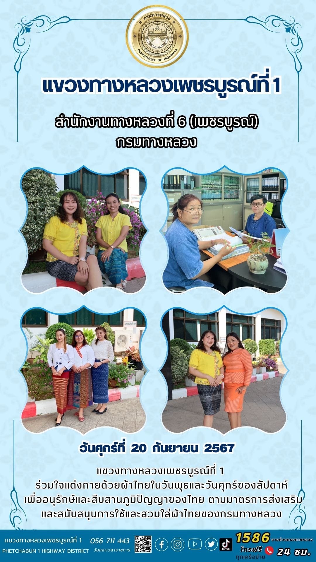 วันศุกร์ที่ 20 กันยายน 2567 แขวงทางหลวงเพชรบูรณ์ที่ 1 ร่วมใจแต่งกายด้วยผ้าไทยในวันพุธและวันศุกร์ของสัปดาห์ เพื่ออนุรักษ์และสืบสานภูมิปัญญาของไทย ตามมาตรการส่งเสริม และสนับสนุนการใช้และสวมใส่ผ้าไทยของกรมทางหลวง