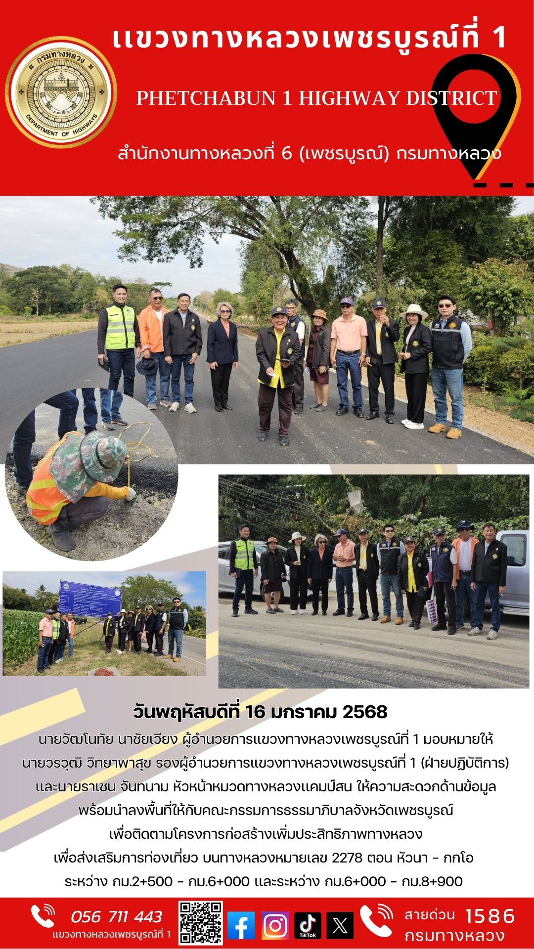 วันพฤหัสบดีที่ 16 มกราคม 2568 นายวัฒโนทัย นาชัยเวียง ผู้อำนวยการแขวงทางหลวงเพชรบูรณ์ที่ 1 มอบหมายให้นายวรวุฒิ วิทยาพาสุข รองผู้อำนวยการแขวงทางหลวงเพชรบูรณ์ที่ 1 (ฝ่ายปฏิบัติการ) เเละนายราเชน จันทนาม หัวหน้าหมวดทางหลวงเเคมป์สน ให้ความสะดวกด้านข้อมูลพร้อมนำลงพื้นที่ให้กับคณะกรรมการธรรมาภิบาลจังหวัดเพชรบูรณ์ เพื่อติดตามโครงการก่อสร้างเพิ่มประสิทธิภาพทางหลวง เพื่อส่งเสริมการท่องเที่ยว บนทางหลวงหมายเลข 2278 ตอน หัวนา - กกโอ ระหว่าง กม.2+500 – กม.6+000 เเละระหว่าง กม.6+000 - กม.8+900