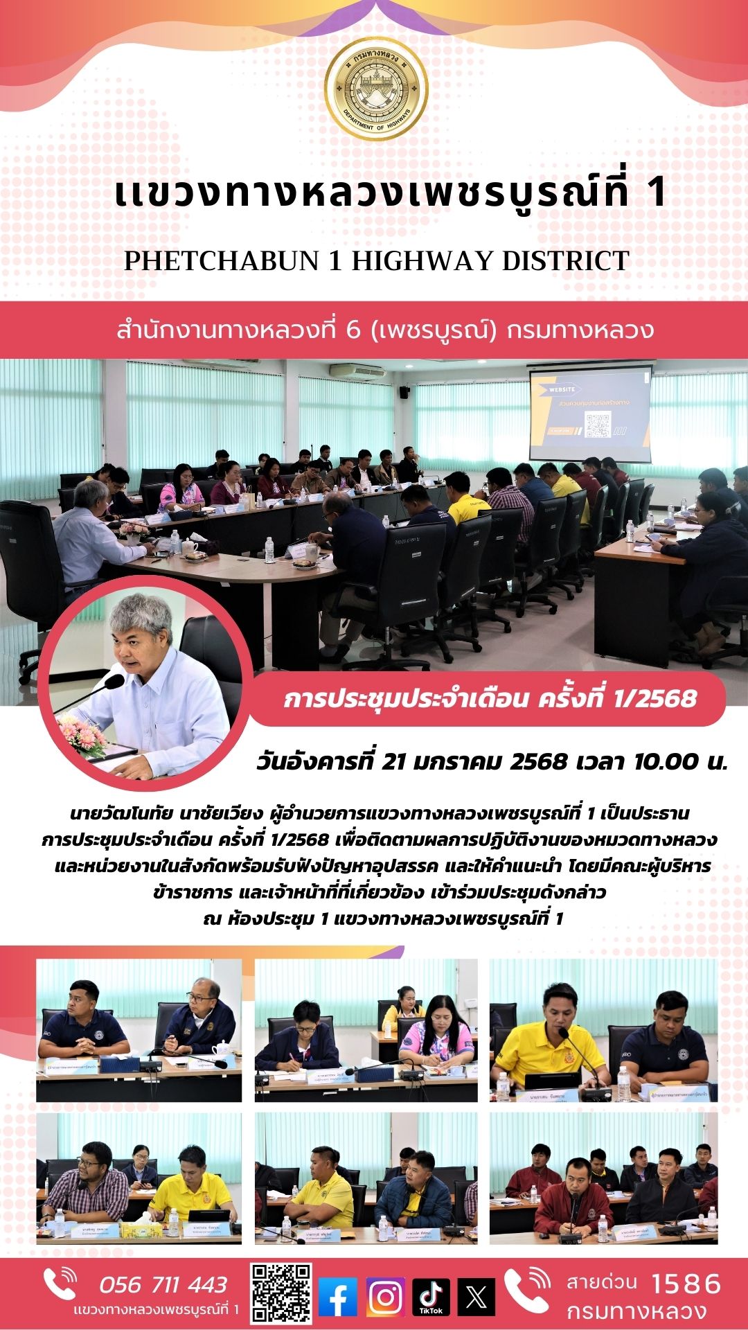 วันอังคารที่ 21 มกราคม 2568 เวลา 10.00 น. นายวัฒโนทัย นาชัยเวียง ผู้อำนวยการแขวงทางหลวงเพชรบูรณ์ที่ 1 เป็นประธาน การประชุมประจำเดือน ครั้งที่ 1/2568 เพื่อติดตามผลการปฏิบัติงานของหมวดทางหลวง และหน่วยงานในสังกัดพร้อมรับฟังปัญหาอุปสรรค และให้คำแนะนำ โดยมีคณะผู้บริหาร ข้าราชการ และเจ้าหน้าที่ที่เกี่ยวข้อง เข้าร่วมประชุมดังกล่าว ณ ห้องประชุม 1 แขวงทางหลวงเพชรบูรณ์ที่ 1