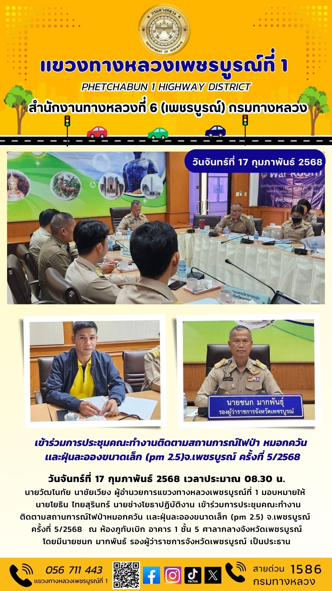 วันจันทร์ที่ 17 กุมภาพันธ์ 2568 เวลาประมาณ 08.30 น. นายวัฒโนทัย นาชัยเวียง ผู้อำนวยการแขวงทางหลวงเพชรบูรณ์ที่ 1 มอบหมายให้ นายโยธิน ไทยสุรินทร์ นายช่างโยธาปฏิบัติงาน เข้าร่วมการประชุมคณะทำงานติดตามสถานการณ์ไฟป่าหมอกควัน เเละฝุ่นละอองขนาดเล็ก (pm 2.5) จ.เพชรบูรณ์ ครั้งที่ 5/2568 ณ ห้องภูทับเบิก อาคาร 1 ชั้น 5 ศาลากลางจังหวัดเพชรบูรณ์โดยมีนายชนก มากพันธ์ รองผู้ว่าราชการจังหวัดเพชรบูรณ์ เป็นประธาน