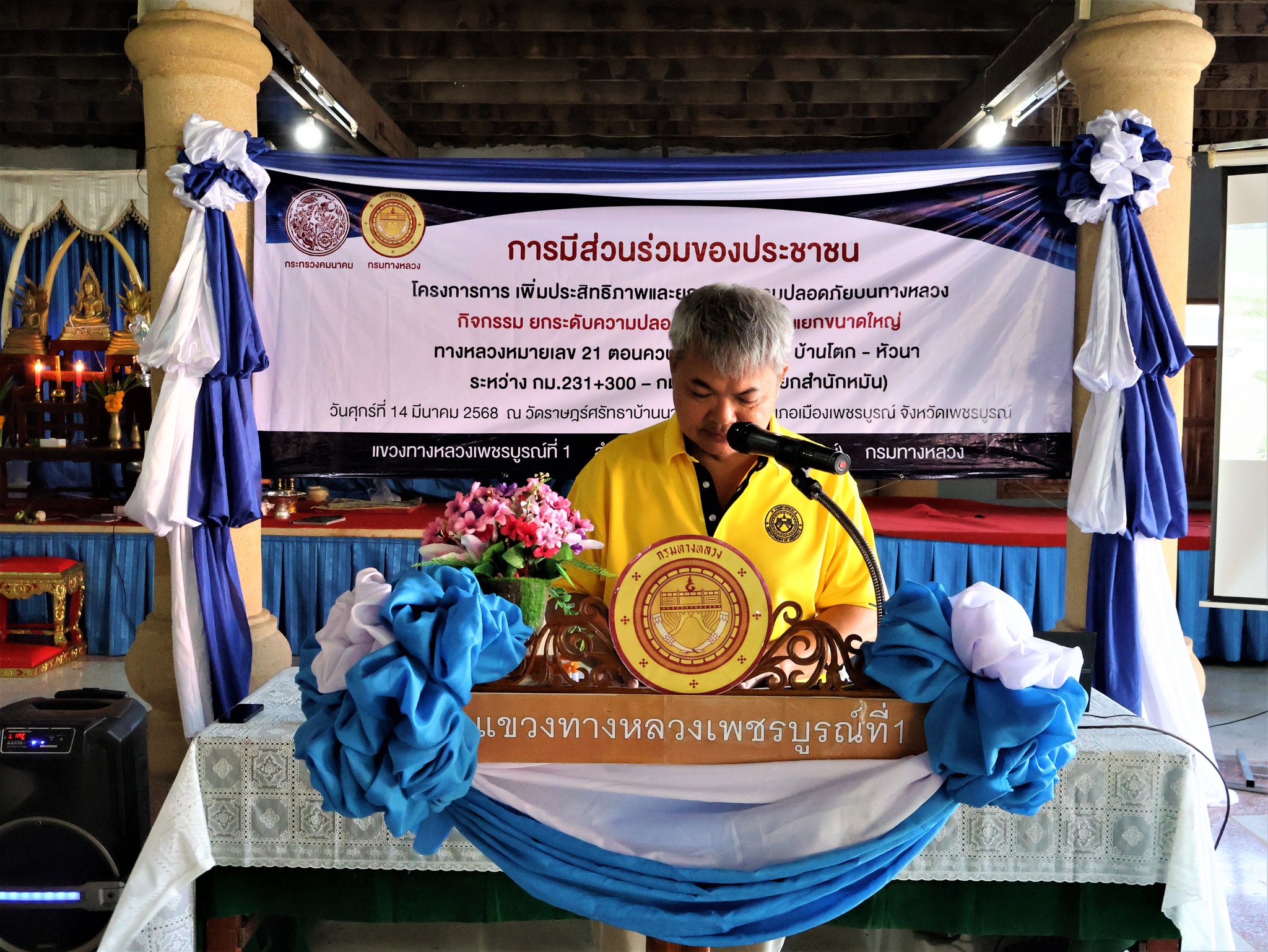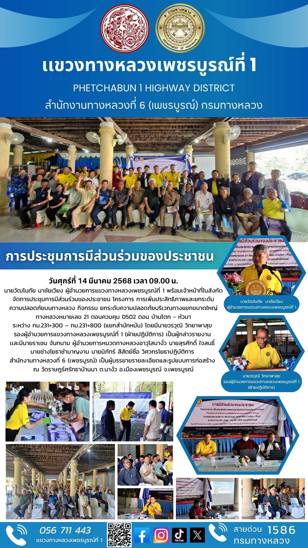วันศุกร์ที่ 14 มีนาคม 2568 เวลา 09.00 น. นายวัฒโนทัย นาชัยเวียง ผู้อำนวยการแขวงทางหลวงเพชรบูรณ์ที่ 1 พร้อมเจ้าหน้าที่ในสังกัด จัดการประชุมการมีส่วนร่วมของประชาชน โครงการ การเพิ่มประสิทธิภาพและยกระดับความปลอดภัยบนทางหลวง กิจกรรม ยกระดับความปลอดภัยบริเวณทางแยกขนาดใหญ่ ทางหลวงหมายเลข 21 ตอนควบคุม 0502 ตอน บ้านโตก - หัวนา ระหว่าง กม.231+300 – กม.231+800 (แยกสำนักหมัน) โดยมีนายวรวุฒิ วิทยาพาสุข รองผู้อำนวยการแขวงทางหลวงเพชรบูรณ์ที่ 1 (ฝ่ายปฏิบัติการ) เป็นผู้กล่าวรายงาน เเละมีนายราเชน จันทนาม ผู้อำนวยการหมวดทางหลวงอาวุโสนางั่ว นายสุรศักดิ์ ใจสนธิ์ นายช่างโยธาชำนาญงาน นายนิภัทร์ สีสัตย์ซื่อ วิศวกรโยธาปฏิบัติการ สำนักงานทางหลวงที่ 6 (เพชรบูรณ์) เป็นผู้บรรยายรายละเอียดและรูปแบบการก่อสร้าง ณ วัดราษฎร์ศรัทธาบ้านนา ต.นางั่ว อ.เมืองเพชรบูรณ์ จ.เพชรบูรณ์