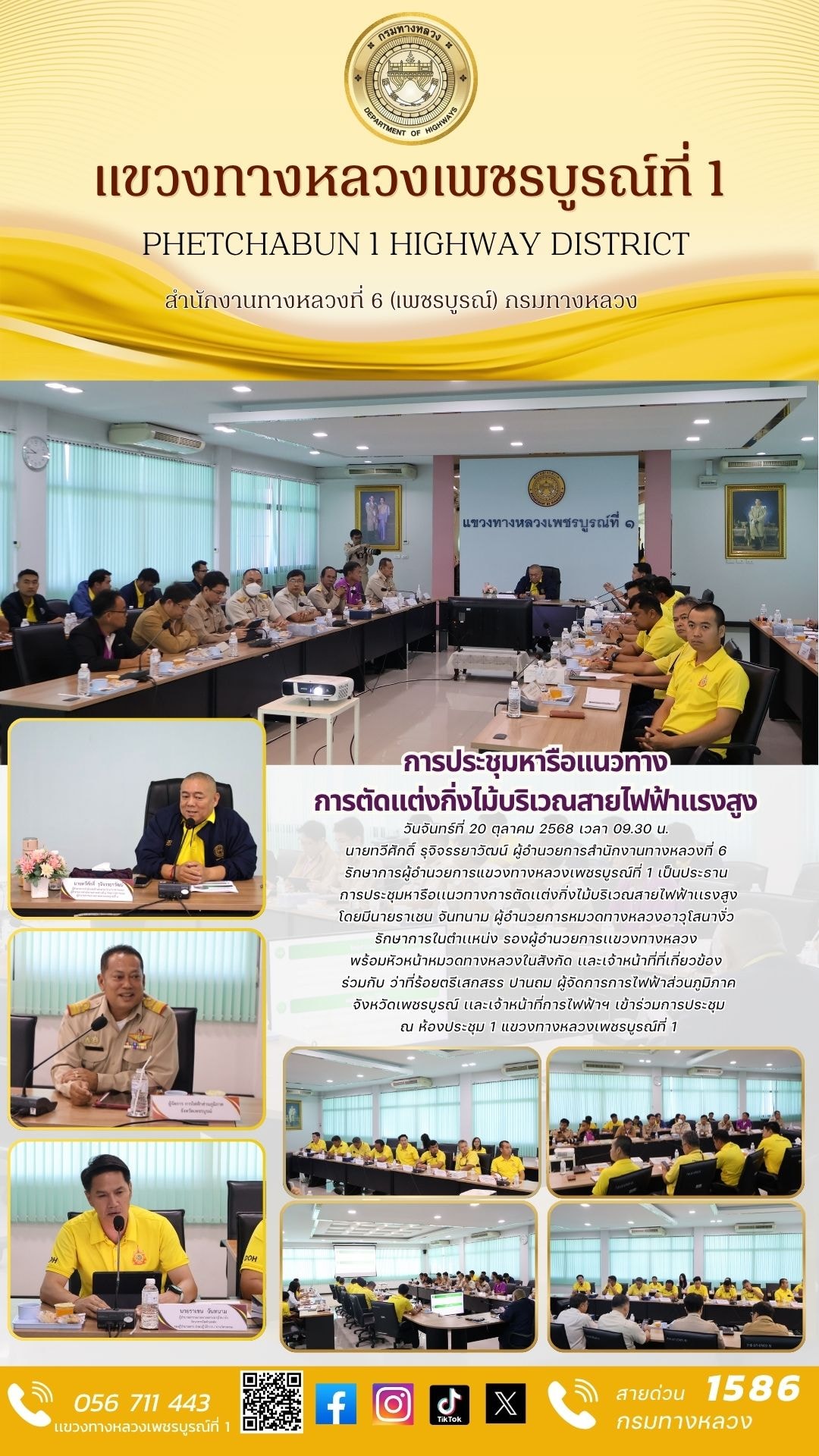 วันจันทร์ที่ 20 ตุลาคม 2568 เวลา 09.30 น. นายทวีศักดิ์ รุจิจรรยาวัฒน์ ผู้อำนวยการสำนักงานทางหลวงที่ 6 รักษาการผู้อำนวยการแขวงทางหลวงเพชรบูรณ์ที่ 1 เป็นประธาน การประชุมหารือเเนวทางการตัดเเต่งกิ่งไม้บริเวณสายไฟฟ้าเเรงสูง โดยมีนายราเชน จันทนาม ผู้อำนวยการหมวดทางหลวงอาวุโสนางั่ว รักษาการในตำเเหน่ง รองผู้อำนวยการเเขวงทางหลวง พร้อมหัวหน้าหมวดทางหลวงในสังกัด เเละเจ้าหน้าที่ที่เกี่ยวข้องร่วมกับ ว่าที่ร้อยตรีเสกสรร ปานถม ผู้จัดการการไฟฟ้าส่วนภูมิภาคจังหวัดเพชรบูรณ์ เเละเจ้าหน้าที่การไฟฟ้าฯ เข้าร่วมการประชุม ณ ห้องประชุม 1 แขวงทางหลวงเพชรบูรณ์ที่ 1