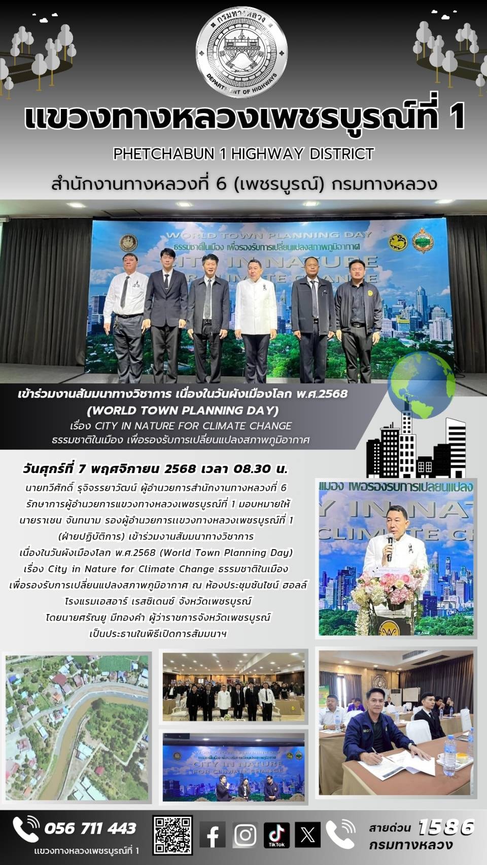 นายทวีศักดิ์ รุจิจรรยาวัฒน์ ผู้อำนวยการสำนักงานทางหลวงที่ 6 รักษาการผู้อำนวยการแขวงทางหลวงเพชรบูรณ์ที่ 1 มอบหมายให้นายราเชน จันทนาม รองผู้อำนวยการเเขวงทางหลวงเพชรบูรณ์ที่ 1 (ฝ่ายปฏิบัติการ) เข้าร่วมงานสัมมนาทางวิชาการ เนื่องในวันผังเมืองโลก พ.ศ.2568 (World Town Planning Day) เรื่อง City in Nature for Climate Change ธรรมชาติในเมือง เพื่อรองรับการเปลี่ยนแปลงสภาพภูมิอากาศ ณ ห้องประชุมซันไชน์ ฮอลล์ โรงแรมเอสอาร์ เรสซิเดนซ์ จังหวัดเพชรบูรณ์โดยนายศรัณยู มีทองคำ ผู้ว่าราชการจังหวัดเพชรบูรณ์ เป็นประธานในพิธีเปิดการสัมมนาฯ