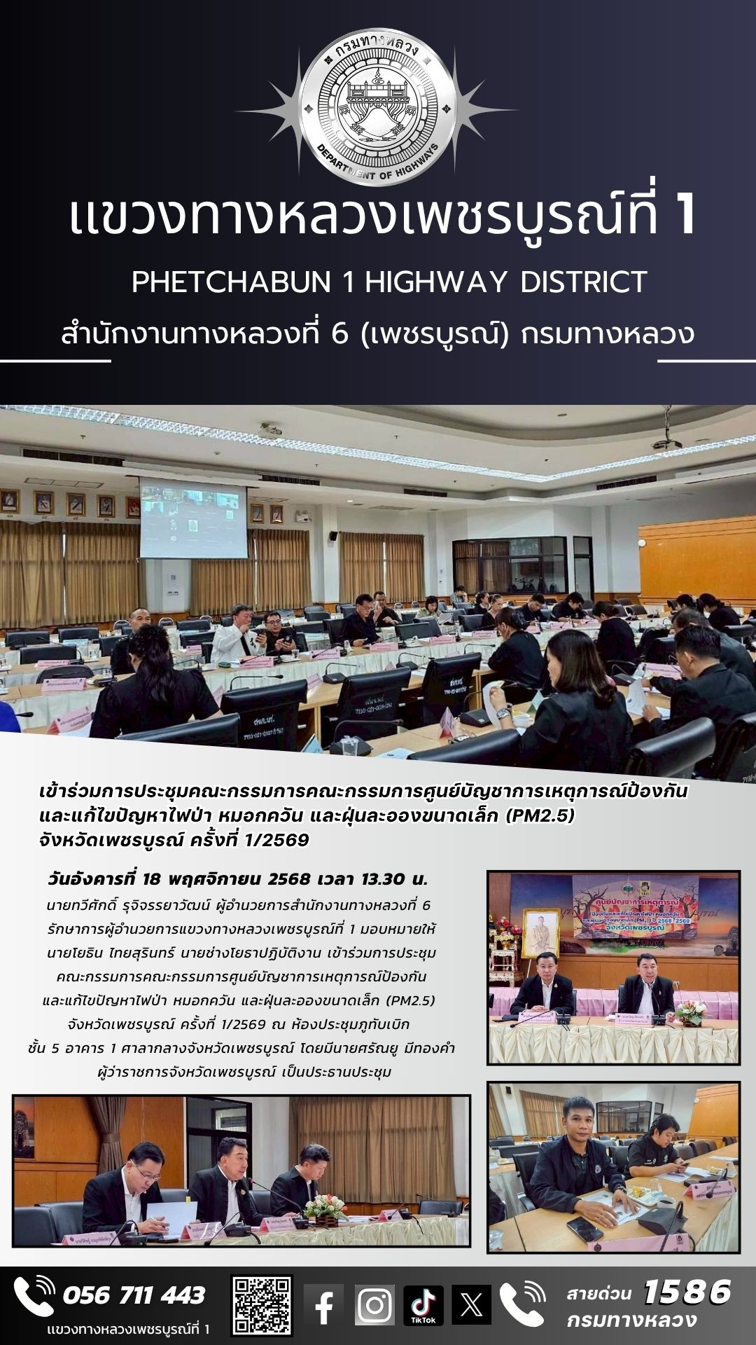 นายทวีศักดิ์ รุจิจรรยาวัฒน์ ผู้อำนวยการสำนักงานทางหลวงที่ 6 รักษาการผู้อำนวยการแขวงทางหลวงเพชรบูรณ์ที่ 1 มอบหมายให้นายโยธิน ไทยสุรินทร์ นายช่างโยธาปฏิบัติงาน เข้าร่วมการประชุมคณะกรรมการคณะกรรมการศูนย์บัญชาการเหตุการณ์ป้องกันและแก้ไขปัญหาไฟป่า หมอกควัน และฝุ่นละอองขนาดเล็ก (PM2.5) จังหวัดเพชรบูรณ์ ครั้งที่ 1/2569 ณ ห้องประชุมภูทับเบิก ชั้น 5 อาคาร 1 ศาลากลางจังหวัดเพชรบูรณ์ โดยมีนายศรัณยู มีทองคำ ผู้ว่าราชการจังหวัดเพชรบูรณ์ เป็นประธานประชุม