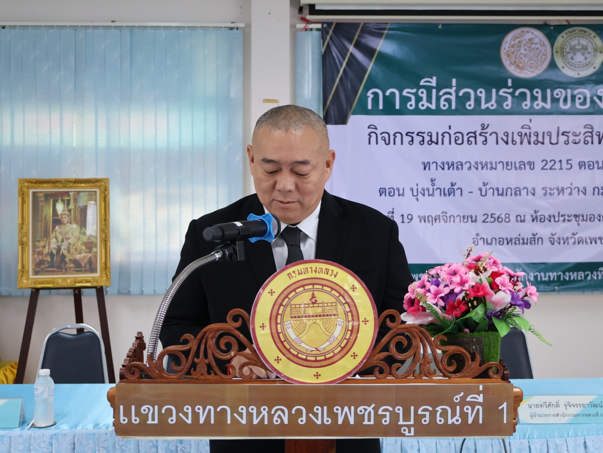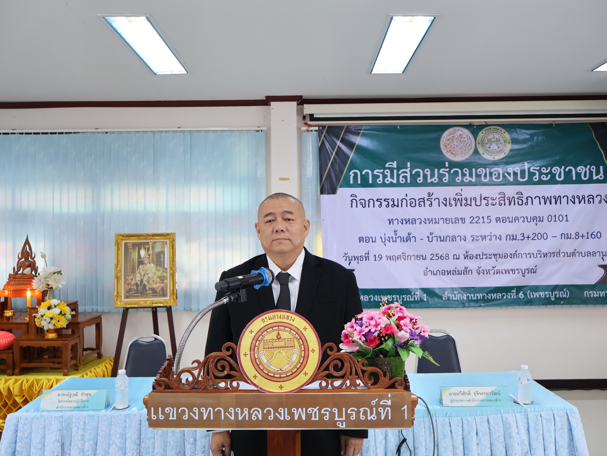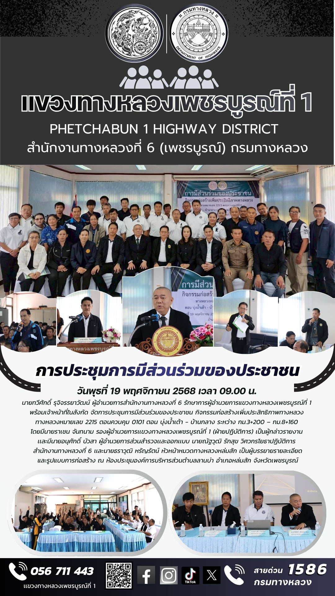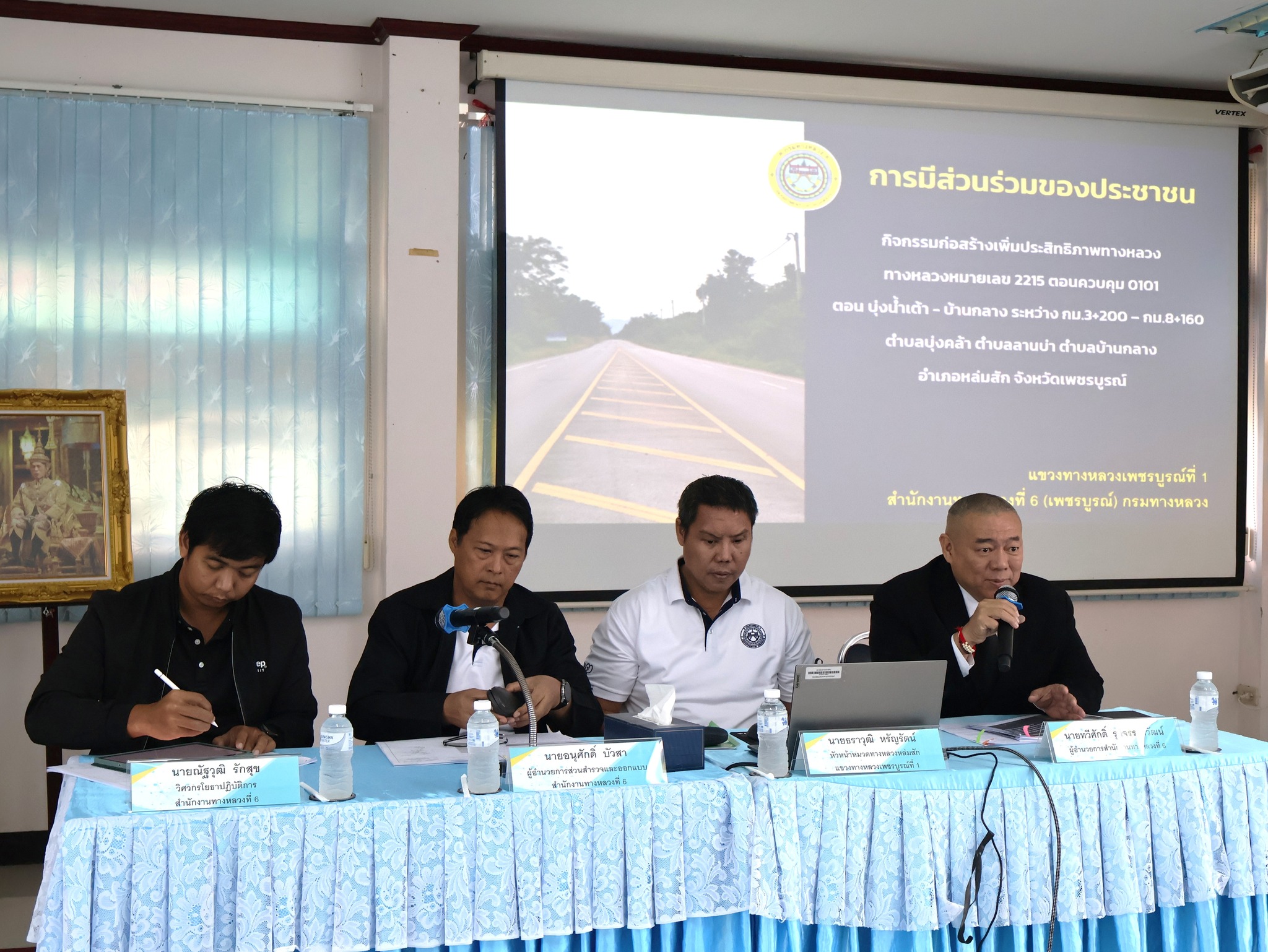 นายทวีศักดิ์ รุจิจรรยาวัฒน์ ผู้อำนวยการสำนักงานทางหลวงที่ 6 รักษาการผู้อำนวยการแขวงทางหลวงเพชรบูรณ์ที่ 1 พร้อมเจ้าหน้าที่ในสังกัด จัดการประชุมการมีส่วนร่วมของประชาชน กิจกรรมก่อสร้างเพิ่มประสิทธิภาพทางหลวง ทางหลวงหมายเลข 2215 ตอนควบคุม 0101 ตอน บุ่งน้ำเต้า - บ้านกลาง ระหว่าง กม.3+200 – กม.8+160 โดยมีนายราเชน จันทนาม รองผู้อำนวยการเเขวงทางหลวงเพชรบูรณ์ที่ 1 (ฝ่ายปฏิบัติการ) เป็นผู้กล่าวรายงาน เเละมีนายอนุศักดิ์ บัวสา ผู้อำนวยการส่วนสำรวจเเละออกเเบบ นายณัฐวุฒิ รักสุข วิศวกรโยธาปฏิบัติการ สำนักงานทางหลวงที่ 6 เเละนายธราวุฒิ หรัญรัตน์ หัวหน้าหมวดทางหลวงหล่มสัก เป็นผู้บรรยายรายละเอียดและรูปแบบการก่อสร้าง ณ ห้องประชุมองค์การบริหารส่วนตำบลลานบ่า อำเภอหล่มสัก จังหวัดเพชรบูรณ์