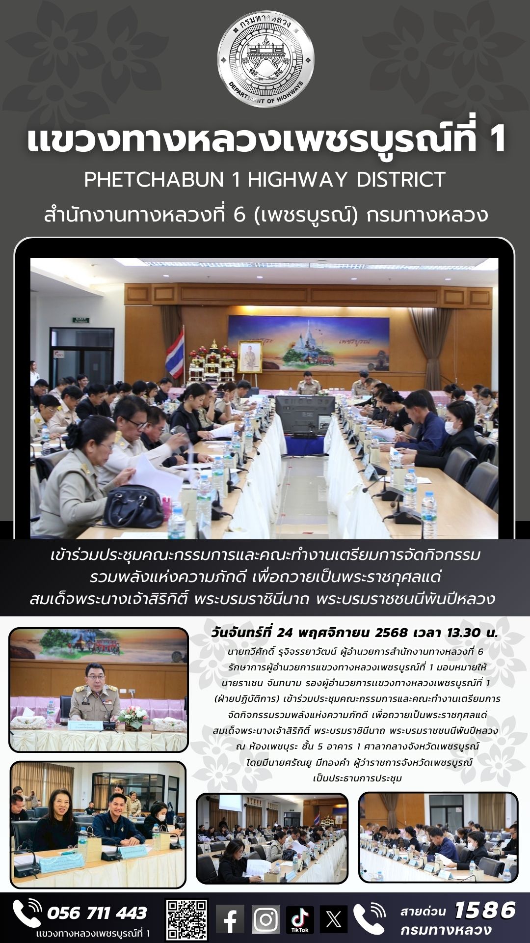 นายทวีศักดิ์ รุจิจรรยาวัฒน์ ผู้อำนวยการสำนักงานทางหลวงที่ 6 รักษาการผู้อำนวยการแขวงทางหลวงเพชรบูรณ์ที่ 1 มอบหมายให้นายราเชน จันทนาม รองผู้อำนวยการเเขวงทางหลวงเพชรบูรณ์ที่ 1 (ฝ่ายปฏิบัติการ) เข้าร่วมประชุมคณะกรรมการและคณะทำงานเตรียมการจัดกิจกรรมรวมพลังแห่งความภักดี เพื่อถวายเป็นพระราชกุศลแด่สมเด็จพระนางเจ้าสิริกิติ์ พระบรมราชินีนาถ พระบรมราชชนนีพันปีหลวง ณ ห้องเพชบุระ ชั้น 5 อาคาร 1 ศาลากลางจังหวัดเพชรบูรณ์ โดยมีนายศรัณยู มีทองคำ ผู้ว่าราชการจังหวัดเพชรบูรณ์ เป็นประธานการประชุม