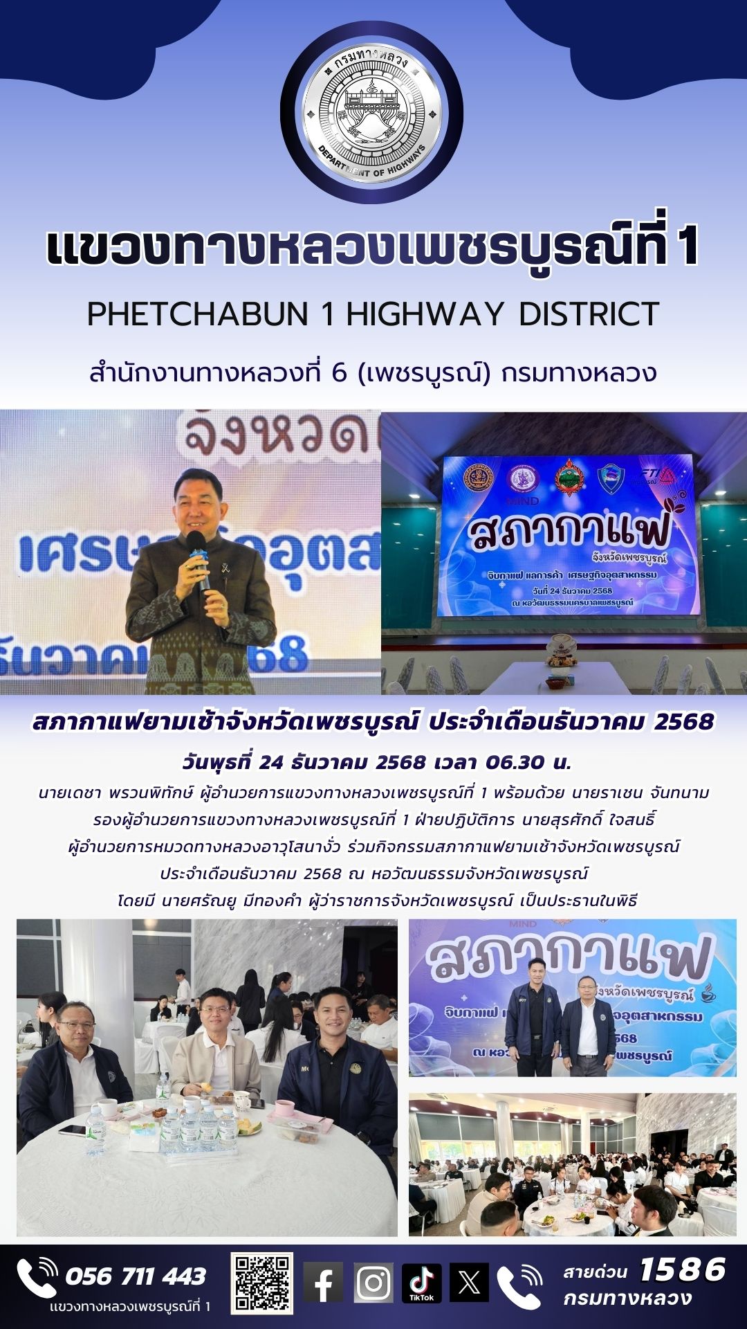 วันพุธที่ 24 ธันวาคม 2568 เวลา 06.30 น. นายเดชา พรวนพิทักษ์ ผู้อำนวยการแขวงทางหลวงเพชรบูรณ์ที่ 1 พร้อมด้วยนายราเชน จันทนาม รองผู้อำนวยการแขวงทางหลวงเพชรบูรณ์ที่ 1 ฝ่ายปฏิบัติการ นายสุรศักดิ์ ใจสนธิ์ ผู้อำนวยการหมวดทางหลวงอาวุโสนางั่ว ร่วมกิจกรรมสภากาแฟยามเช้าจังหวัดเพชรบูรณ์ ประจำเดือนธันวาคม 2568 ณ หอวัฒนธรรมจังหวัดเพชรบูรณ์ โดยมี นายศรัณยู มีทองคำ ผู้ว่าราชการจังหวัดเพชรบูรณ์ เป็นประธานในพิธี