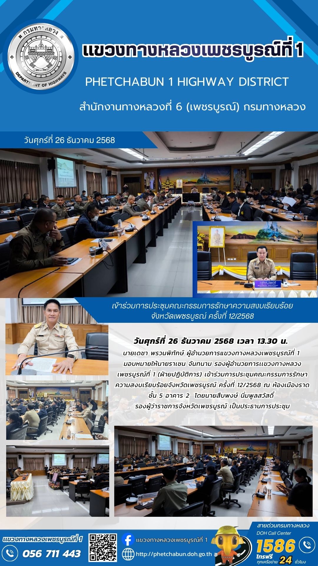 นายเดชา พรวนพิทักษ์ ผู้อำนวยการแขวงทางหลวงเพชรบูรณ์ที่ 1 มอบหมายให้นายราเชน จันทนาม รองผู้อำนวยการเเขวงทางหลวงเพชรบูรณ์ที่ 1 (ฝ่ายปฏิบัติการ) เข้าร่วมการประชุมคณะกรรมการรักษาความสงบเรียบร้อยจังหวัดเพชรบูรณ์ ครั้งที่ 12/2568 ณ ห้องเมืองราด ชั้น 5 อาคาร 2 โดยนายสืบพงษ์ นิ่มพูลสวัสดิ์ รองผู้ว่าราชการจังหวัดเพชรบูรณ์ เป็นประธานการประชุม