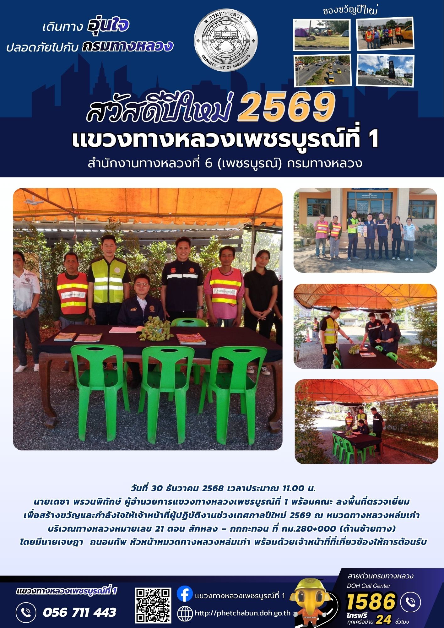 นายเดชา พรวนพิทักษ์ ผู้อำนวยการแขวงทางหลวงเพชรบูรณ์ที่ 1 พร้อมคณะ ลงพื้นที่ตรวจเยี่ยมเพื่อสร้างขวัญและกำลังใจให้เจ้าหน้าที่ผู้ปฏิบัติงานช่วงเทศกาลปีใหม่ 2569 ณ หมวดทางหลวงหล่มเก่า บริเวณทางหลวงหมายเลข 21 ตอน สักหลง – กกกะทอน ที่ กม.280+000 (ด้านซ้ายทาง)