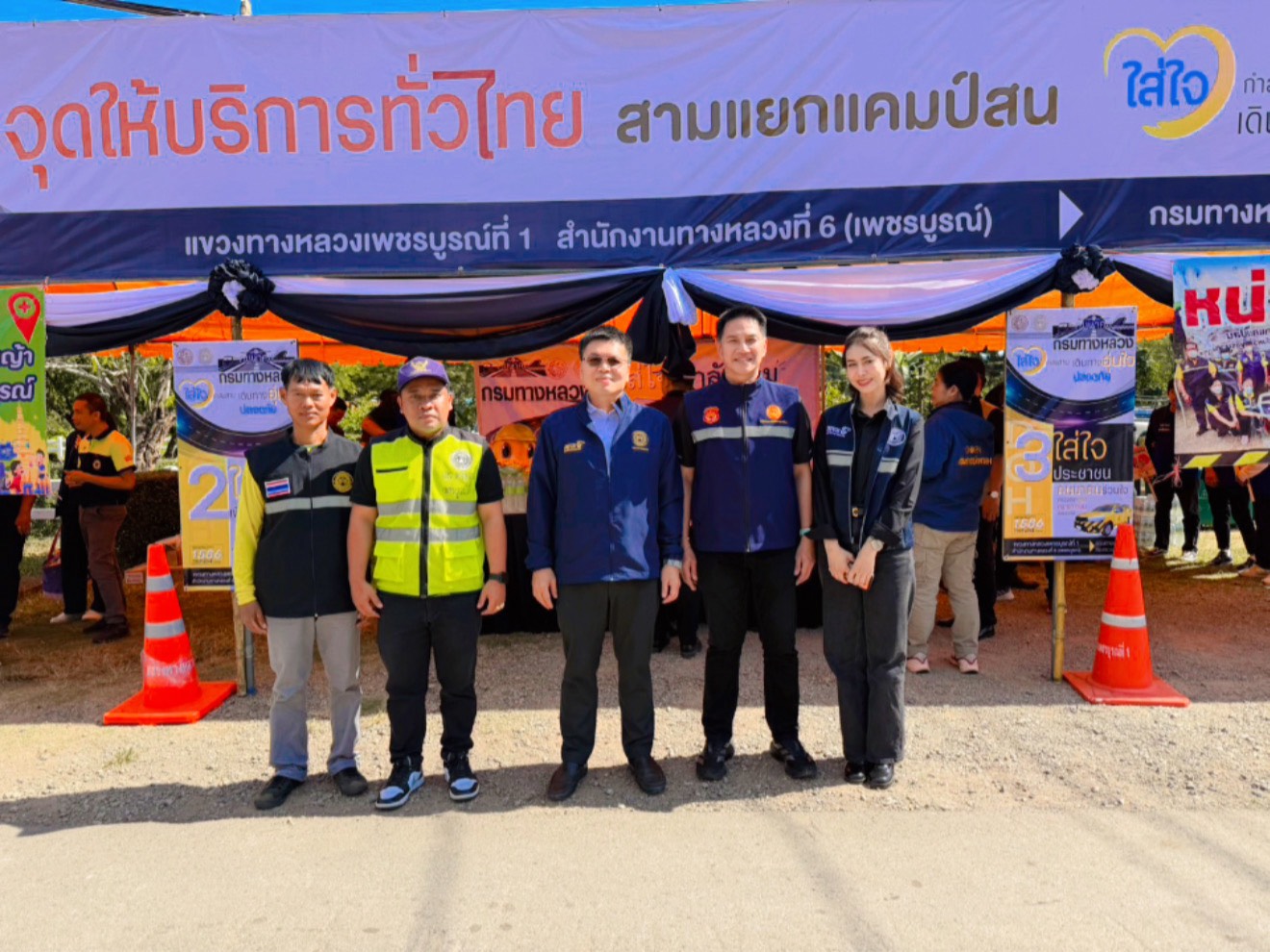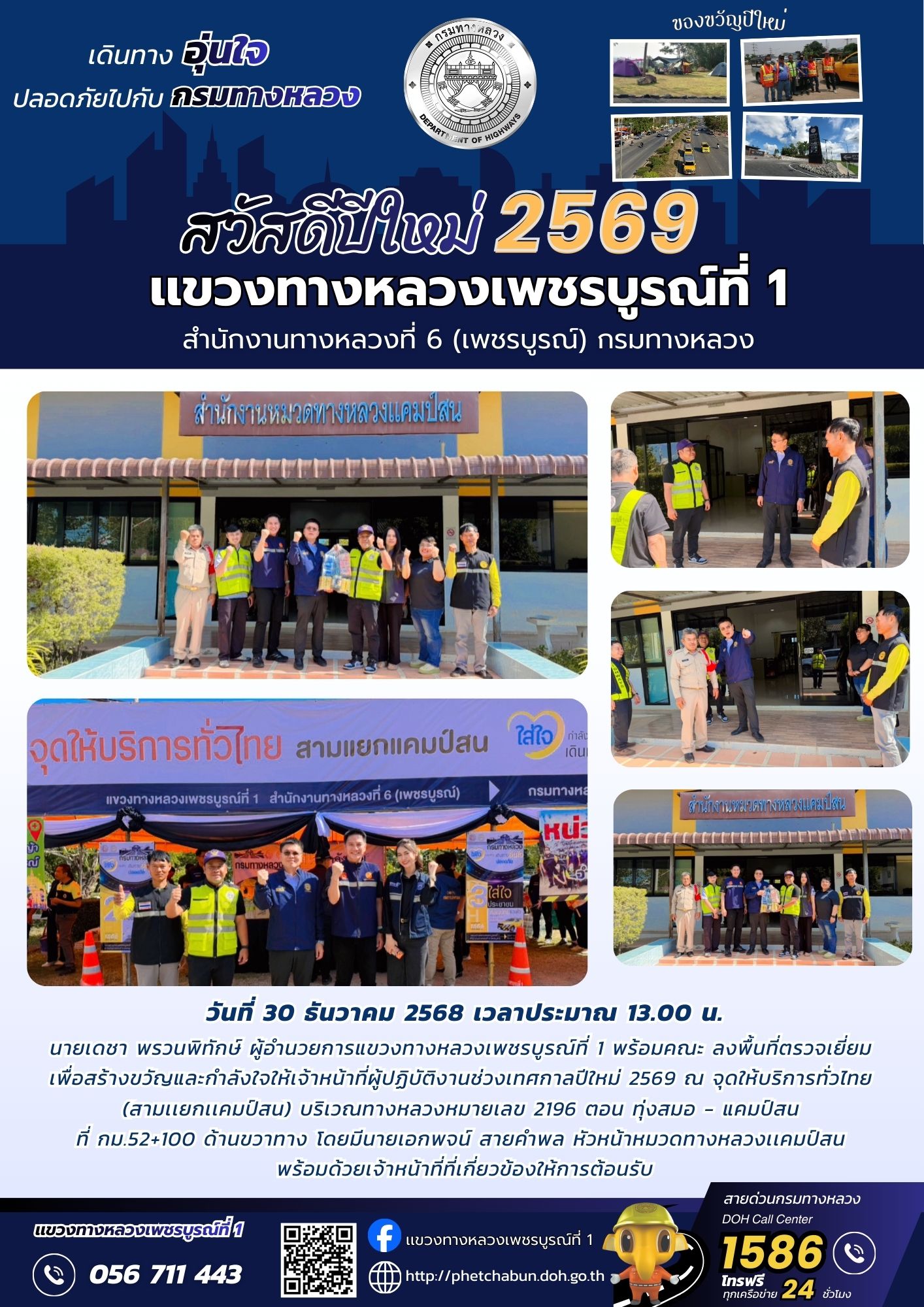 นายเดชา พรวนพิทักษ์ ผู้อำนวยการแขวงทางหลวงเพชรบูรณ์ที่ 1 พร้อมคณะ ลงพื้นที่ตรวจเยี่ยม เพื่อสร้างขวัญและกำลังใจให้เจ้าหน้าที่ผู้ปฏิบัติงานช่วงเทศกาลปีใหม่ 2569 ณ จุดให้บริการทั่วไทย (สามเเยกเเคมป์สน) บริเวณทางหลวงหมายเลข 2196 ตอน ทุ่งสมอ - แคมป์สน ที่ กม.52+100 ด้านขวาทาง โดยมีนายเอกพจน์ สายคำพล หัวหน้าหมวดทางหลวงเเคมป์สน พร้อมด้วยเจ้าหน้าที่ที่เกี่ยวข้องให้การต้อนรับ