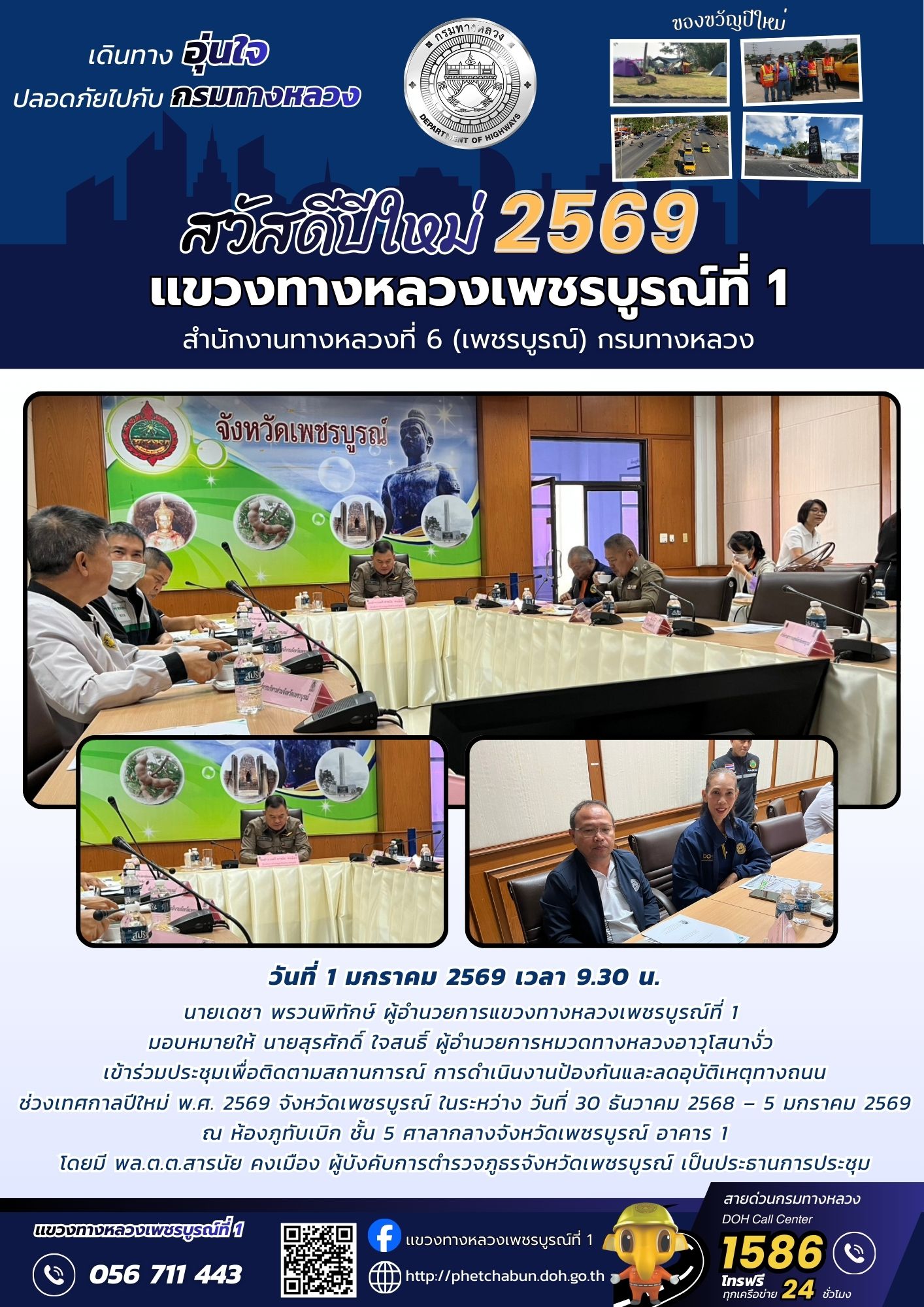 วันที่ 1 มกราคม 2569 เวลา 9.30 น. นายเดชา พรวนพิทักษ์ ผู้อำนวยการแขวงทางหลวงเพชรบูรณ์ที่ 1 มอบหมายให้ นายสุรศักดิ์ ใจสนธิ์ ผู้อำนวยการหมวดทางหลวงอาวุโสนางั่ว เข้าร่วมประชุมเพื่อติดตามสถานการณ์ การดำเนินงานป้องกันและลดอุบัติเหตุทางถนนช่วงเทศกาลปีใหม่ พ.ศ. 2569 จังหวัดเพชรบูรณ์ ในระหว่าง วันที่ 30 ธันวาคม 2568 – 5 มกราคม 2569 ณ ห้องภูทับเบิก ชั้น 5 ศาลากลางจังหวัดเพชรบูรณ์ อาคาร 1 โดยมี พล.ต.ต.สารนัย คงเมือง ผู้บังคับการตำรวจภูธรจังหวัดเพชรบูรณ์ เป็นประธานการประชุม