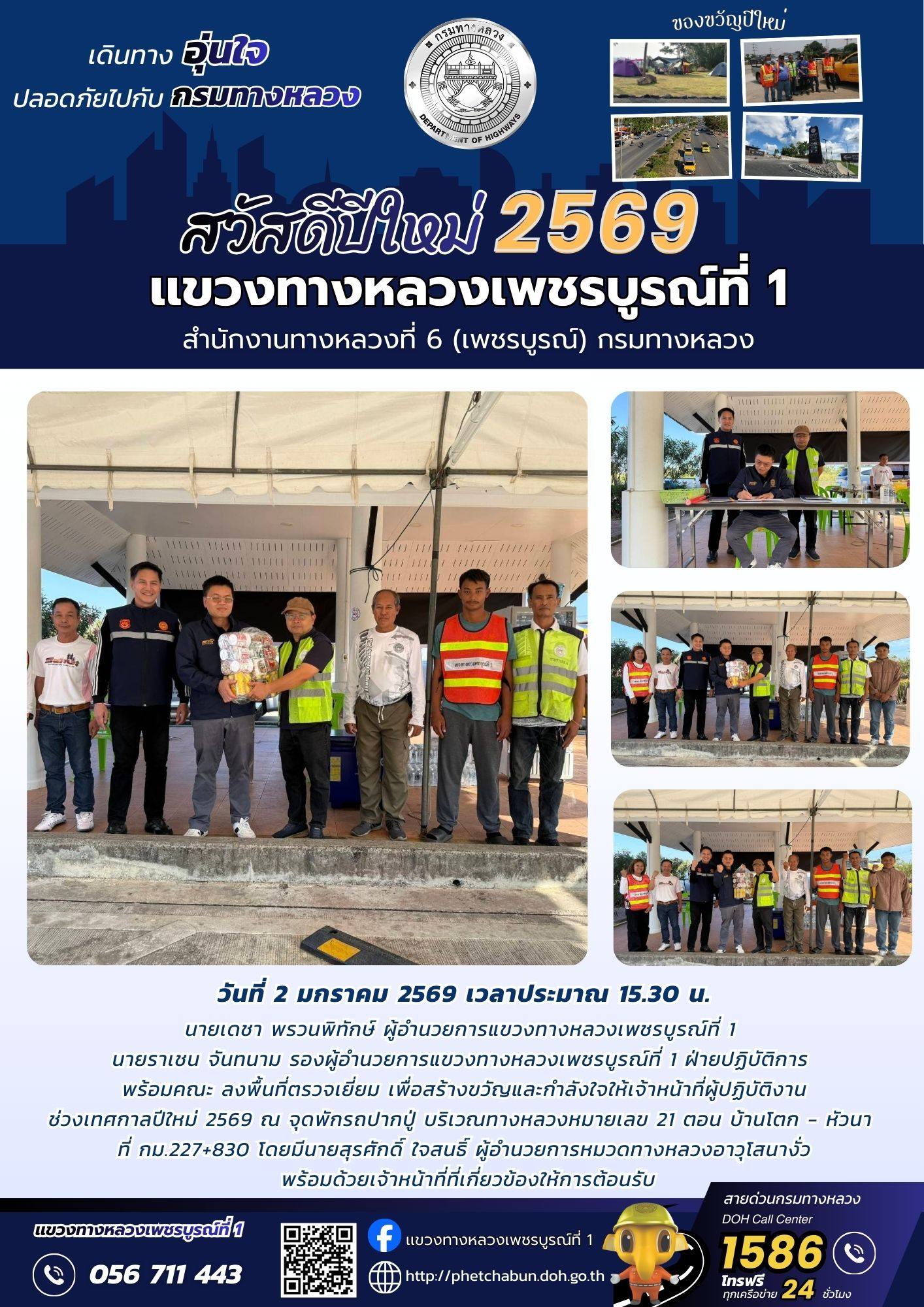 นายเดชา พรวนพิทักษ์ ผู้อำนวยการแขวงทางหลวงเพชรบูรณ์ที่ 1 นายราเชน จันทนาม รองผู้อำนวยการแขวงทางหลวงเพชรบูรณ์ที่ 1 ฝ่ายปฏิบัติการ พร้อมคณะ ลงพื้นที่ตรวจเยี่ยม เพื่อสร้างขวัญและกำลังใจให้เจ้าหน้าที่ผู้ปฏิบัติงานช่วงเทศกาลปีใหม่ 2569 ณ จุดพักรถปากปู่ บริเวณทางหลวงหมายเลข 21 ตอน บ้านโตก - หัวนา