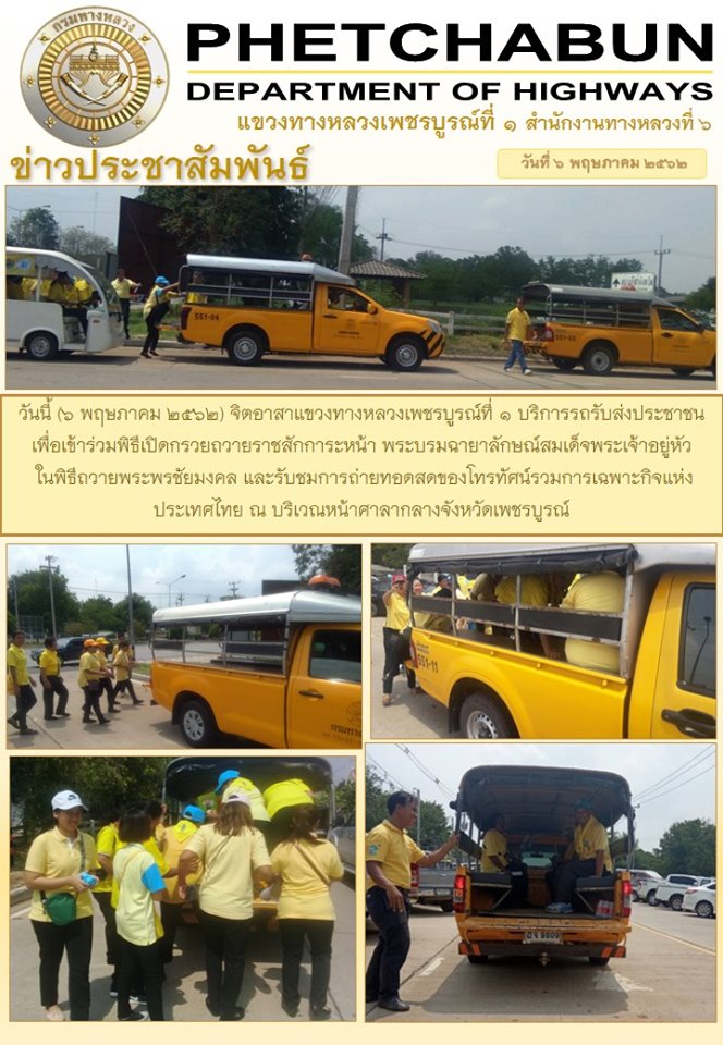 วันนี้ (6 พฤษภาคม 2562) จิตอาสาแขวงทางหลวงเพชรบูรณ์ที่ 1 บริการรถรับส่งประชาชนเพื่อเข้าร่วมพิธีเปิดกรวยถวายราชสักการะหน้า พระบรมฉายาลักษณ์สมเด็จพระเจ้าอยู่หัว ในพิธีถวายพระพรชัยมงคล และรับชมการถ่ายทอดสดของโทรทัศน์รวมการเฉพาะกิจแห่งประเทศไทย ณ บริเวณหน้าศาลากลางจังหวัดเพชรบูรณ์