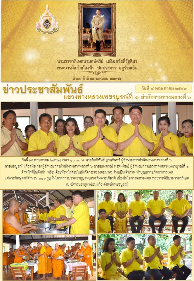 เจ้าหน้าที่ในสังกัด พร้อมด้วยหัวหน้าส่วนในสังกัดกระทรวงคมนาคมร่วมเป็นเจ้าภาพ ทำบุญถวายภัตตาหารเพล แด่พระภิกษุสงฆ์จำนวน 110 รูป ในโครงการบรรพชาอุปสมบทเฉลิมพระเกียรติ เนื่องในโอกาสมหามงคล พระราชพิธีบรมราชาภิเษก ณ วัดพระธาตุผาซ่อนแก้ว จังหวัดเพชรบูรณ์