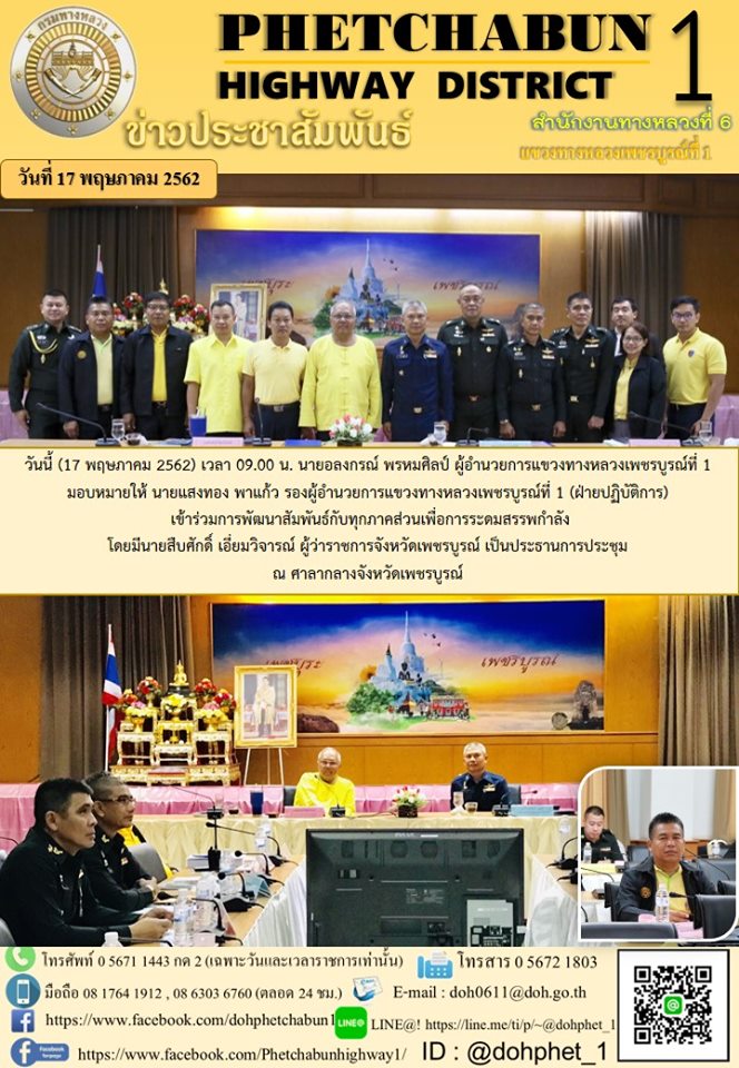วันนี้ (17 พฤษภาคม 2562) เวลา 09.00 น. นายอลงกรณ์ พรหมศิลป์ ผู้อำนวยการแขวงทางหลวงเพชรบูรณ์ที่ 1 มอบหมายให้ นายแสงทอง พาแก้ว รองผู้อำนวยการแขวงทางหลวงเพชรบูรณ์ที่ 1 (ฝ่ายปฏิบัติการ) เข้าร่วมการพัฒนาสัมพันธ์กับทุกภาคส่วนเพื่อการระดมสรรพกำลัง โดยมีนายสืบศักดิ์ เอี่ยมวิจารณ์ ผู้ว่าราชการจังหวัดเพชรบูรณ์ เป็นประธานการประชุม ณ ศาลากลางจังหวัดเพชรบูรณ์