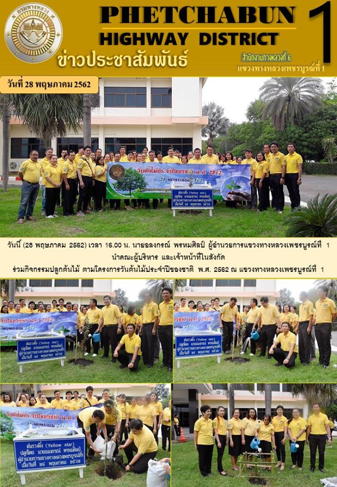 วันนี้ (28 พฤษภาคม 2562) เวลา 16.00 น. นายอลงกรณ์ พรหมศิลป์ ผู้อำนวยการแขวงทางหลวงเพชรบูรณ์ที่ 1 นำคณะผู้บริหาร และเจ้าหน้าที่ในสังกัด ร่วมกิจกรรมปลูกต้นไม้ ตามโครงการวันต้นไม้ประจำปีของชาติ พ.ศ. 2562 ณ แขวงทางหลวงเพชรบูรณ์ที่ 1