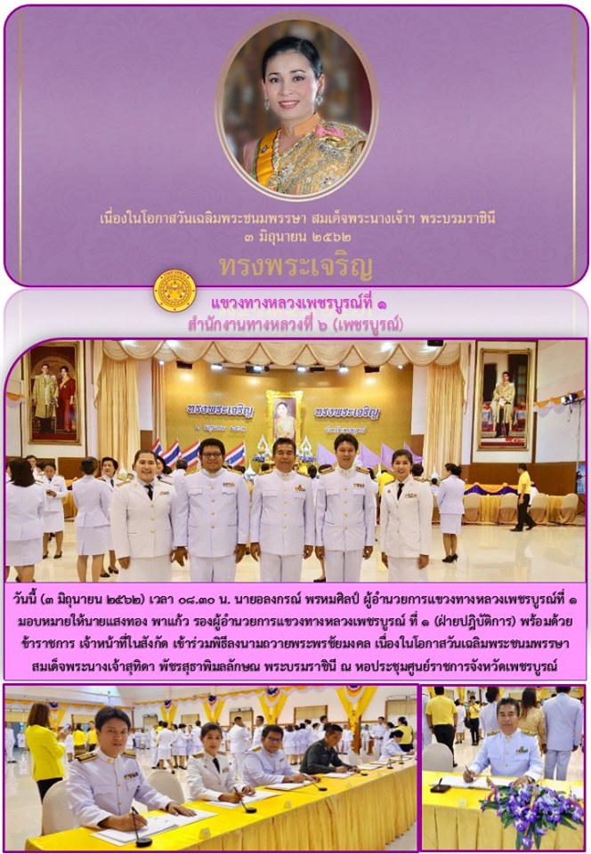 วันนี้ (3 มิถุนายน 2562) เวลา 08.30 น. นายอลงกรณ์ พรหมศิลป์ ผู้อำนวยการแขวงทางหลวงเพชรบูรณ์ที่ 1 มอบหมายให้นายแสงทอง พาแก้ว รองผู้อำนวยการแขวงทางหลวงเพชรบูรณ์ ที่ 1 (ฝ่ายปฎิบัติการ) พร้อมด้วย ข้าราชการ เจ้าหน้าที่ในสังกัด เข้าร่วมพิธีลงนามถวายพระพรชัยมงคล เนื่องในโอกาสวันเฉลิมพระชนมพรรษาสมเด็จพระนางเจ้าสุทิดา พัชรสุธาพิมลลักษณ พระบรมราชินี ณ หอประชุมศูนย์ราชการจังหวัดเพชรบูรณ์