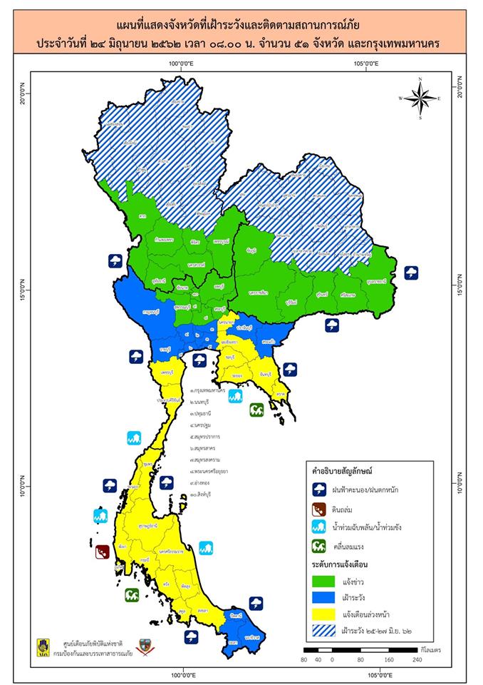 ตามรายงานการแจ้งข่าวแจ้งเตือนสาธารณภัยของกรมป้องกันและบรรเทาสาธารณภัย กระทรวงมหาดไทย ประจำวันที่ 24 มิถุนายน 2562