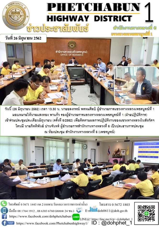 วันนี้ (26 มิถุนายน 2562) เวลา 13.30 น. นายอลงกรณ์ พรหมศิลป์ ผู้อำนวยการแขวงทางหลวงเพชรบูรณ์ที่ 1 มอบหมายให้นายแสงทอง พาแก้ว รองผู้อำนวยการแขวงทางหลวงเพชรบูรณ์ที่ 1 (ฝ่ายปฏิบัติการ) เข้าร่วมประชุมประเดือนมิถุนายน (ครั้งที่ 6/2562) เพื่อติดตามผลการปฏิบัติงานของแขวงทางหลวงในสังกัดฯ โดนมี นายกิตติพันธ์ ปานจันทร์ ผู้อำนวยการสำนักงานทางหลวงที่ 6 เป็นประธานการประชุม ณ ห้องประชุม สำนักงานทางหลวงที่ 6 (เพชรบูรณ์)