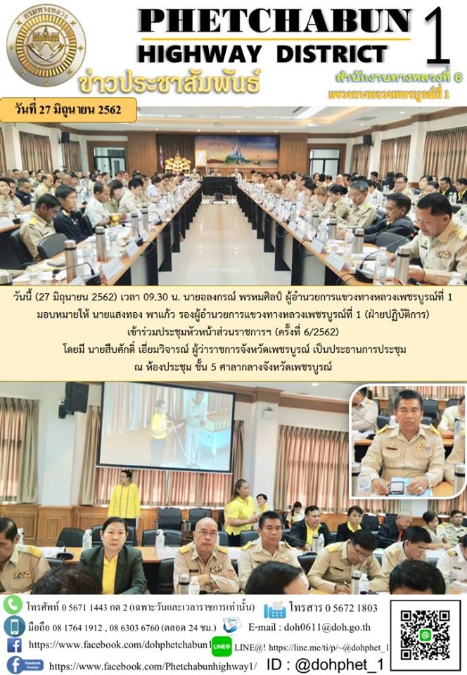 วันนี้ (27 มิถุนายน 2562) เวลา 09.30 น. นายอลงกรณ์ พรหมศิลป์ ผู้อำนวยการแขวงทางหลวงเพชรบูรณ์ที่ 1 มอบหมายให้นายแสงทอง พาแก้ว รองผู้อำนวยการแขวงทางหลวงเพชรบูรณ์ที่ 1 (ฝ่ายปฏิบัติการ) เข้าร่วมประชุมหัวหน้าส่วนราชการฯ (ครั้งที่ 6/2562) โดยมี นายสืบศักดิ์ เอี่ยมวิจารณ์ ผู้ว่าราชการจังหวัดเพชรบูรณ์ เป็นประธานการประชุม ณ ห้องประชุม ชั้น 5 ศาลากลางจังหวัดเพชรบูรณ์