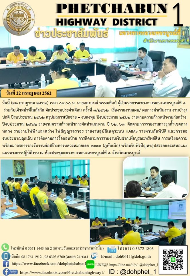 ร่วมกับเจ้าหน้าที่ในสังกัด จัดประชุมประจำเดือน ครั้งที่ 7/2562 เรื่องรายงานแผน/ ผลการดำเนินงาน งานบำรุงปกติ ปีงบประมาณ 2562 สรุปผลการเบิกจ่าย – งบลงทุน ปีงบประมาณ 2562 รายงานความก้าวหน้างานก่อสร้าง