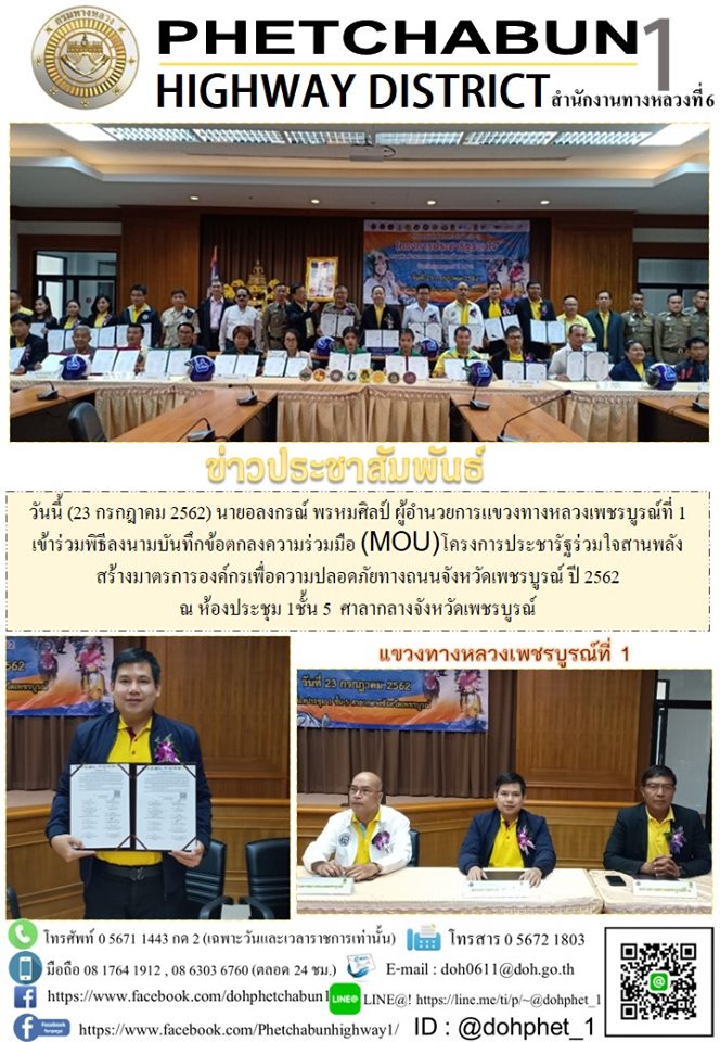 วันนี้ (23 กรกฎาคม 2562) นายอลงกรณ์ พรหมศิลป์ ผู้อำนวยการแขวงทางหลวงเพชรบูรณ์ที่ 1เข้าร่วมพิธีลงนามบันทึกข้อตกลงความร่วมมือ (MOU)โครงการประชารัฐร่วมใจสานพลังสร้างมาตรการองค์กรเพื่อความปลอดภัยทางถนนจังหวัดเพชรบูรณ์ ปี 2562