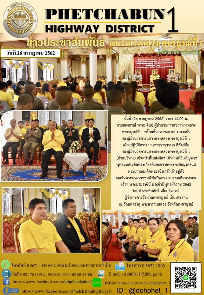 วันนี้ (26 กรกฎาคม 2562) เวลา 14.00 น. นายอลงกรณ์ พรหมศิลป์ ผู้อำนวยการแขวงทางหลวงเพชรบูรณ์ที่ 1 พร้อมด้วยนายแสงทอง พาแก้ว รองผู้อำนวยการแขวงทางหลวงเพชรบูรณ์ที่ 1 (ฝ่ายปฏิบัติการ) นางสาวจารุวรรณ สีสัตย์ซื่อ (ฝ่ายบริหาร) เจ้าหน้าที่ในสังกัดฯ เข้าร่วมพิธีเจริญพระพุทธมนต์เฉลิมพระเกียรติถวายพระพรชัยมงคลแด่ พระบาทสมเด็จพระวชิรเกล้าเจ้าอยู่หัวสมเด็จพระบรมราชชนนีพันปีหลวง สมเด็จพระนางเจ้าฯ พระบรมราชินี ประจำปีพุทธศักราช 2562 โดยมี นายสืบศักดิ์ เอี่ยมวิจารณ์ ผู้ว่าราชการจังหวัดเพชรบูรณ์ เป็นประธาน ณ วัดมหาธาตุ พระอารามหลวง จังหวัดเพชรบูรณ์