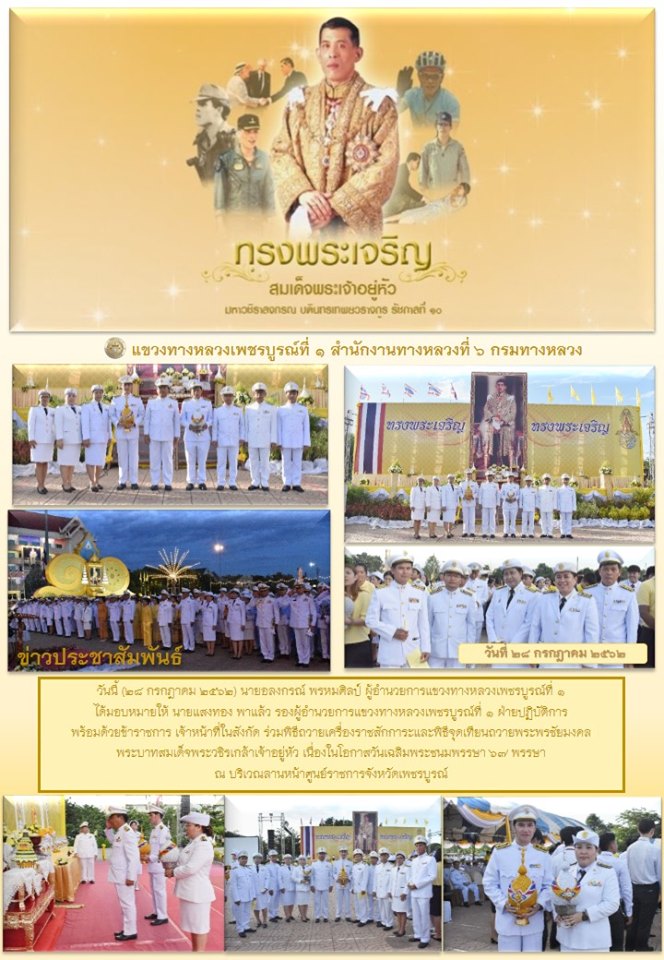 วันนี้ (28 กรกฎาคม 2562) นายอลงกรณ์ พรหมศิลป์ ผู้อำนวยการแขวงทางหลวงเพชรบูรณ์ที่ 1ได้มอบหมายให้ นายแสงทอง พาแล้ว รองผู้อำนวยการแขวงทางหลวงเพชรบูรณ์ที่ 1 ฝ่ายปฏิบัติการ พร้อมด้วยข้าราชการ เจ้าหน้าที่ในสังกัด ร่วมพิธีถวายเครื่องราชสักการะและพิธีจุดเทียนถวายพระพรชัยมงคล