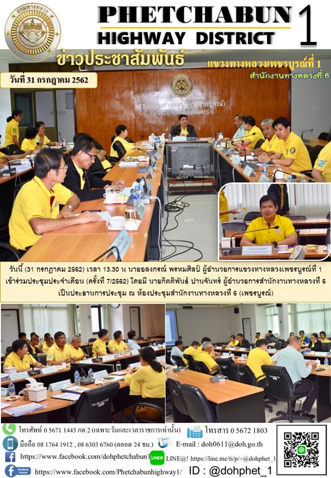 วันนี้ (31 กรกฎาคม 2562) เวลา 13.30 น นายอลงกรณ์ พรหมศิลป์ ผู้อำนวยการแขวงทางหลวงเพชรบูรณ์ที่ 1 เข้าร่วมประชุมประจำเดือน (ครั้งที่ 7/2562) โดยมี นายกิตติพันธ์ ปานจันทร์ ผู้อำนวยการสำนักงานทางหลวงที่ 6 เป็นประธานการประชุม ณ ห้องประชุมสำนักงานทางหลวงที่ 6 (เพชรบูรณ์)