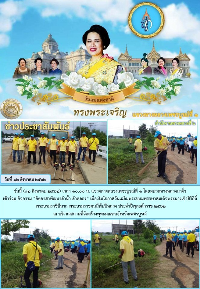 วันนี้ (12 สิงหาคม 2562) เวลา 10.00 น. แขวงทางหลวงเพชรบูรณ์ที่ 1 โดยหมวดทางหลวงนางั่ว เข้าร่วม กิจกรรม “จิตอาสาพัฒนาลำน้ำ ลำคลอง” เนื่องในโอกาสวันเฉลิมพระชนมพรรษาสมเด็จพระนางเจ้าสิริกิติ์ พระบรมราชินีนาถ พระบรมราชชนนีพันปีหลวง ประจำปีพุทธศักราช 2562 ณ บริเวณสถานที่จัดสร้างพุทธมณฑลจังหวัดเพชรบูรณ์