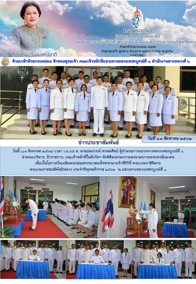 วันนี้ (13 สิงหาคม 2562) เวลา 08.45 น. นายอลงกรณ์ พรหมศิลป์ ผู้อำนวยการแขวงทางหลวงเพชรบูรณ์ที่ 1 นำคณะบริหาร, ข้าราชการ, และเจ้าหน้าที่ในสังกัดฯ จัดพิธีลงนามถวายลงนามถวายพระพรชัยมงคล เนื่องในโอกาสวันเฉลิมพระชนมพรรษาสมเด็จพระนางเจ้าสิริกิติ์ พระบรมราชินีนาถ พระบรมราชชนนีพันปีหลวง ประจำปีพุทธศักราช 2562 ณ แชวงทางหลวงเพชรบูรณ์ที่ 1