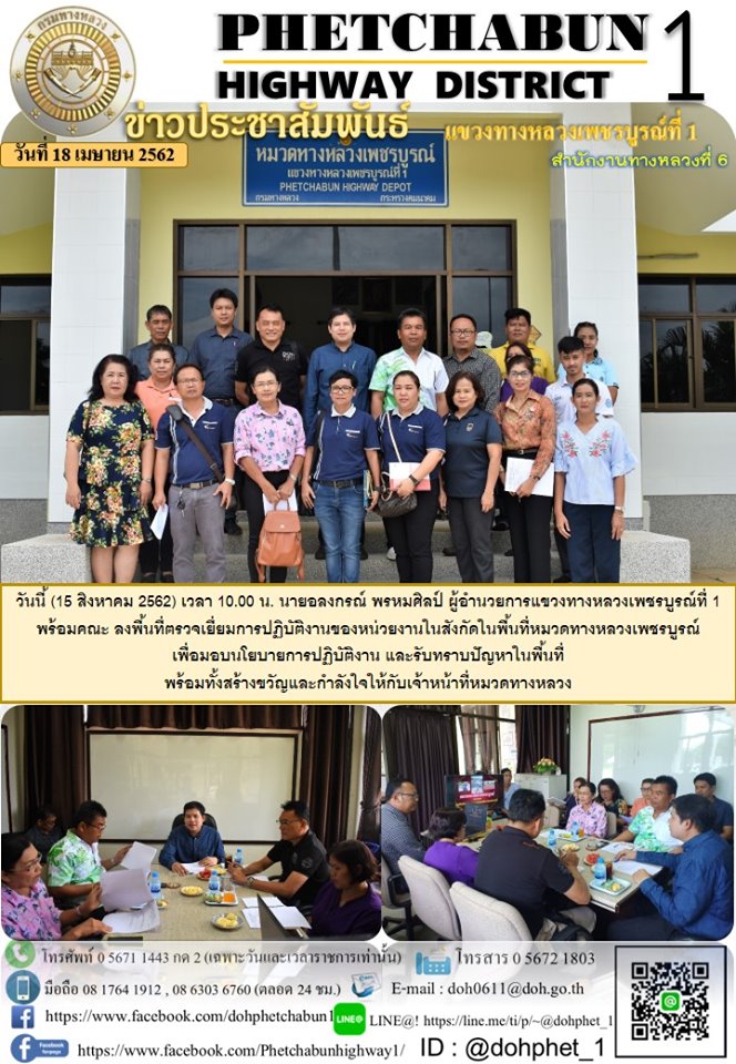 วันนี้ (15 สิงหาคม 2562) เวลา 10.00 น. นายอลงกรณ์ พรหมศิลป์ ผู้อำนวยการแขวงทางหลวงเพชรบูรณ์ที่ 1 พร้อมคณะ ลงพื้นที่ตรวจเยี่ยมการปฏิบัติงานของหน่วยงานในสังกัดในพื้นที่หมวดทางหลวงเพชรบูรณ์ เพื่อมอบนโยบายการปฏิบัติงาน และรับทราบปัญหาในพื้นที่ พร้อมทั้งสร้างขวัญและกำลังใจให้กับเจ้าหน้าที่หมวดทางหลวง