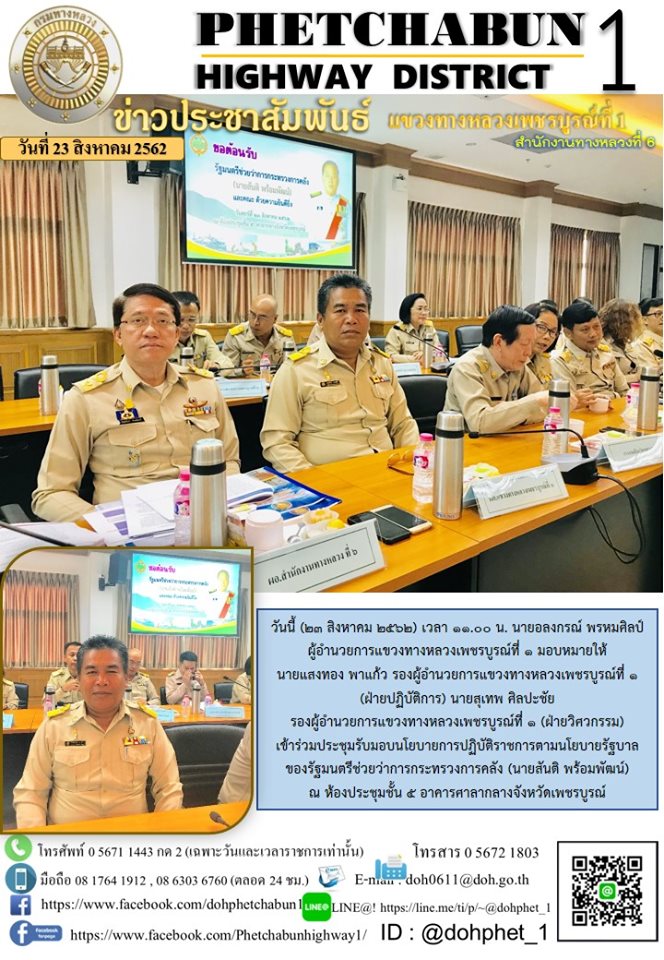 วันนี้ (23 สิงหาคม 2562) เวลา 11.00 น. นายอลงกรณ์ พรหมศิลป์ ผู้อำนวยการแขวงทางหลวงเพชรบูรณ์ที่ 1 มอบหมายให้ นายแสงทอง พาแก้ว รองผู้อำนวยการแขวงทางหลวงเพชรบูรณ์ที่ 1 (ฝ่ายปฏิบัติการ) นายสุเทพ ศิลปะชัย รองผู้อำนวยการแขวงทางหลวงเพชรบูรณ์ที่ 1 (ฝ่ายวิศวกรรม) เข้าร่วมประชุมรับมอบนโยบายการปฏิบัติราชการตามนโยบายรัฐบาล ของรัฐมนตรีช่วยว่าการกระทรวงการคลัง (นายสันติ พร้อมพัฒน์) ณ ห้องประชุมชั้น 5 อาคารศาลากลางจังหวัดเพชรบูรณ์