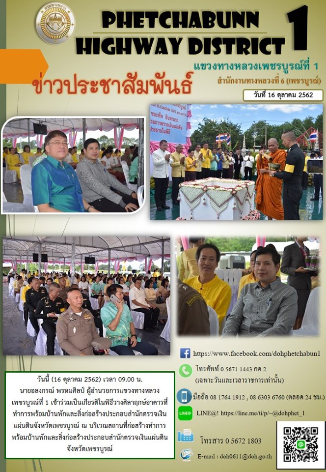 วันนี้ (16 ตุลาคม 2562) เวลา 09.00 น. นายอลงกรณ์ พรหมศิลป์ ผู้อำนวยการแขวงทางหลวงเพชรบูรณ์ที่ 1 เข้าร่วมเป็นเกียรติในพิธีวางศิลาฤกษ์อาคารที่ทำการพร้อมบ้านพักและสิ่งก่อสร้างประกอบสำนักตรวจเงินแผ่นดินจังหวัดเพชรบูรณ์ ณ บริเวณสถานที่ก่อสร้างทำการพร้อมบ้านพักและสิ่งก่อสร้างประกอบสำนักตรวจเงินแผ่นดินจังหวัดเพชรบูรณ์