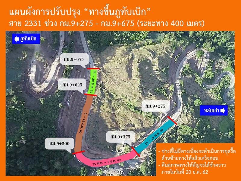 14 พฤศจิกายน 2562 ผู้สื่อข่าวรายงานว่านายอลงกรณ์ พรหมศิลป์ ผู้อำนวยการแขวงทางหลวงเพชรบูรณ์ที่ 1 กล่าวว่า แขวงทางหลวงเพชรบูรณ์ที่ 1 สำนักงานทางหลวงที่ 6 กรมทางหลวง กำลังดำเนินการก่อสร้างซ่อมแซมถนนภูทับเบิก “งานฟื้นฟูทางหลวง” ในทางหลวงหมายเลข 2331 ตอน โจ๊ะโหวะ – อุทยานแห่งชาติภูหินร่องกล้า (ตอน 1-4) ระหว่าง กม.8+875 – กม.15+550 งบประมาณ 160 ล้านเศษ นั้น ขณะนี้แขวงทางหลวงเพชรบูรณ์ที่ 1 ได้เร่งดำเนินการเพื่อบรรเทาความเดือดร้อนของผู้ใช้ทางและนักท่องเที่ยว โดยจะขุดรื้อชั้นทางเดิม ในช่วงก่อสร้าง สาย 2331 ตอน 2 ช่วง กม.9+425 – กม.9+700 ในวันที่ 15 พฤศจิกายน 2562 และจะทำการคืนสภาพทาง และเปิดพื้นที่ให้บริการชั่วคราวอีกครั้ง ในช่วง กลางเดือน ธันวาคม 2562 ซึ่งทำให้การสัญจรเกิดความไม่สะดวก และอาจเกิดอันตราย จึงขอประชาสัมพันธ์ให้ผู้ใช้ทางและนักท่องเที่ยว ใช้เส้นทาง สาย 12 – นครไทย – ภูทับเบิก แทน และขออภัยในความไม่สะดวกมา ณ โอกาส นี้แขวงทางหลวงเพชรบูรณ์ที่ 1 ขอแนะนำเส้นทางเลี่ยง ดังนี้1. ถ้ามาจาก กทม. ให้ใช้ถนน สาย 12 (แยกพ่อขุนผาเมือง) ถึงแยกบ้านแยงให้เลี้ยวขวาเข้าเส้นทาง สาย 2013 – ถึงแยกหนองกะท้าวให้เลี้ยวขวาเข้า สาย 2331 และเดินทางต่อจนถึงภูทับเบิกโดยสะดวก2. ถ้ามาจาก อ.ด่านซ้าย ให้ใช้ถนนสาย 2013 ถึงแยกนครไทยให้เลี้ยวซ้าย สาย 2331 และเดินทางต่อจนถึงภูทับเบิกโดยสะดวก3. ถ้ามาจาก จ.พิษณุโลก ให้ใช้ถนน สาย 12 ถึงแยกบ้านแยงให้เลี้ยวซ้ายเข้าเส้นทาง สาย 2013 – ถึงแยกหนองกะท้าวให้เลี้ยวขวาเข้า สาย 2331 และเดินทางต่อจนถึงภูทับเบิกโดยสะดวก4. ถ้ามาจาก จ.ขอนแก่น ให้ใช้ถนน สาย 12 (แยกพ่อขุนผาเมือง) ถึงแยกบ้านแยงให้เลี้ยวขวาเข้าเส้นทาง สาย 2013 – ถึงแยกหนองกะท้าวให้เลี้ยวขวาเข้า สาย 2331 และ เดินทางต่อจนถึงภูทับเบิกโดยสะดวก