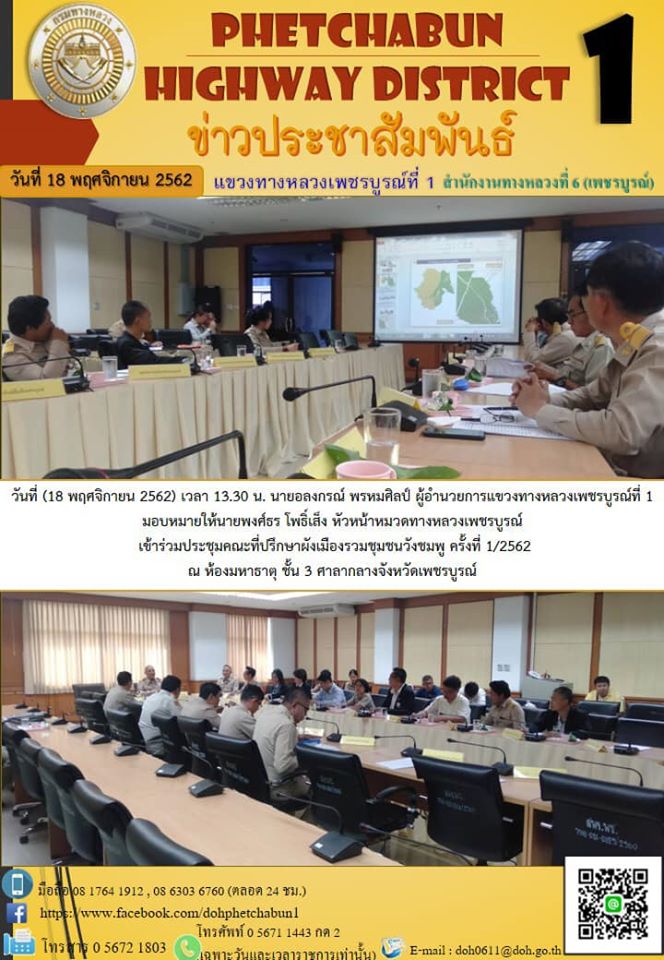 วันที่ (18 พฤศจิกายน 2562) เวลา 13.30 น. นายอลงกรณ์ พรหมศิลป์ ผู้อำนวยการแขวงทางหลวงเพชรบูรณ์ที่ 1 มอบหมายให้ นายพงศ์ธร โพธิ์เส็ง หัวหน้าหมวดทางหลวงเพชรบูรณ์ เข้าร่วมประชุมคณะที่ปรึกษาผังเมืองรวมชุมชนวังชมพู ครั้งที่1/2562 ณ ห้องมหาธาตุ ชั้น3 ศาลากลางจังหวัดเพชรบูรณ์