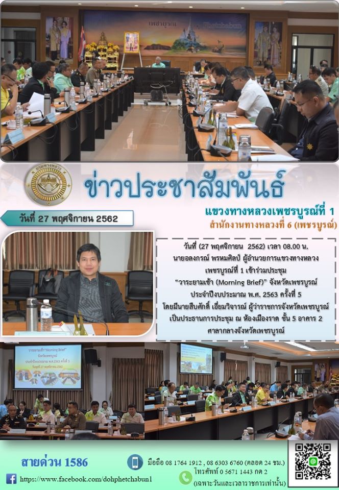 วันที่ (27 พฤศจิกายน 2562) เวลา 08.00 น. นายอลงกรณ์ พรหมศิลป์ ผู้อำนวยการแขวงทางหลวงเพชรบูรณ์ที่ 1 เข้าร่วมประชุม “วาระยามเช้า (Morning Brief)” จังหวัดเพชรบูรณ์ ประจำปีงบประมาณ พ.ศ. 2563 ครั้งที่ 5 โดยมีนายสืบศักดิ์ เอี่ยมวิจารณ์ ผู้ว่าราชการจังหวัดเพชรบูรณ์ เป็นประธานการประชุม ณ ห้องเมืองราด ชั้น 5 อาคาร 2 ศาลากลางจังหวัดเพชรบูรณ์