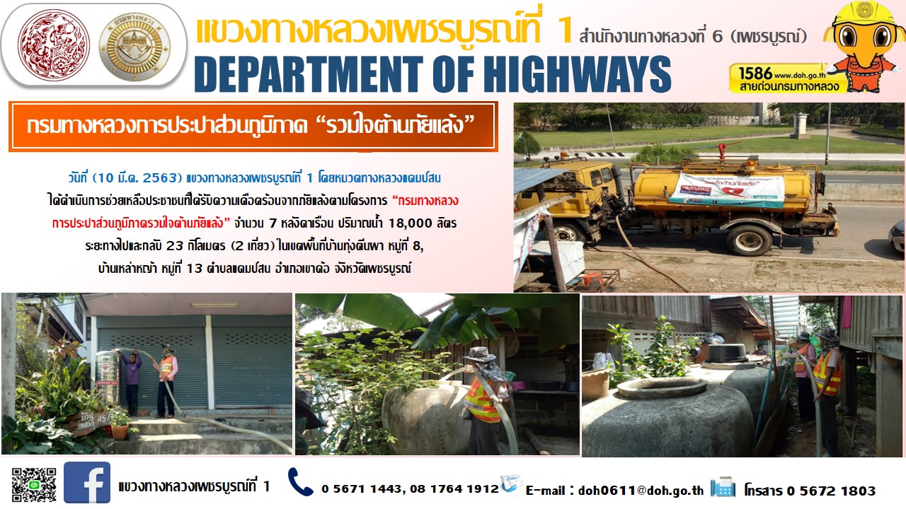 วันที่ (10 มี.ค. 2563) แขวงทางหลวงเพชรบูรณ์ที่ 1 โดยหมวดทางหลวงแคมป์สนได้ดำเนินการช่วยเหลือประชาชนที่ได้รับความเดือดร้อนจากภัยแล้งตามโครงการ “กรมทางหลวง การประปาส่วนภูมิภาครวมใจต้านภัยแล้ง” จำนวน 7 หลังคาเรือน ปริมาณน้ำ 18,000 ลิตร ระยะทางไปและกลับ 23 กิโลเมตร (2 เที่ยว) ในเขตพื้นที่บ้านทุ่งตีนผา หมู่ที่ 8, บ้านเหล่าหญ้า หมู่ที่ 13 ตำบลแคมป์สน อำเภอเขาค้อ จังหวัดเพชรบูรณ์